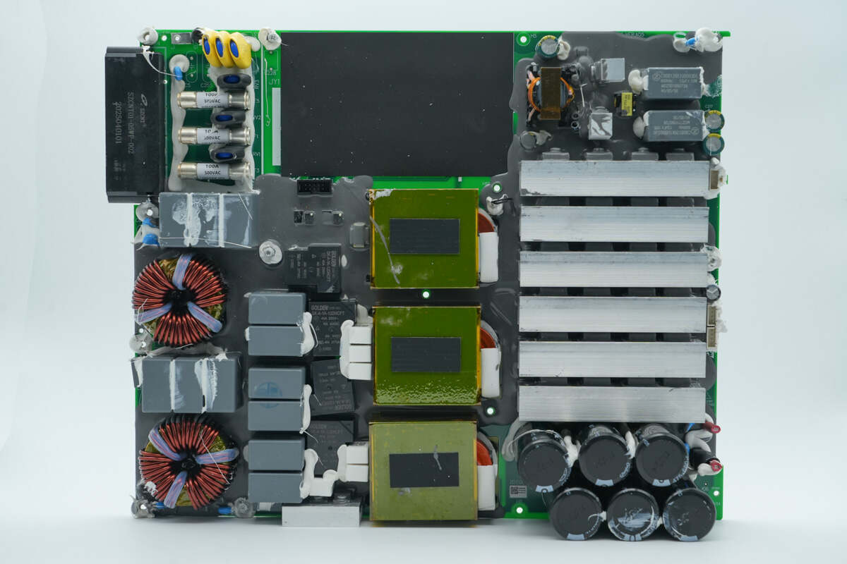 The front side of the PFC module features fuses, varistors, safety X2 capacitors, common mode chokes, relays, startup resistors, and PFC boost inductors. The heatsinks on the right dissipate heat from the PFC MOSFETs and rectifiers. Below the heatsinks are high-voltage filter capacitors.