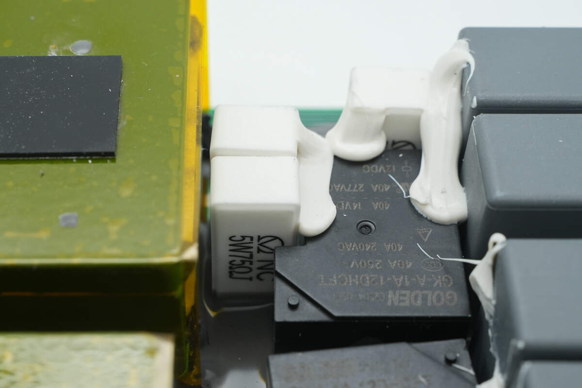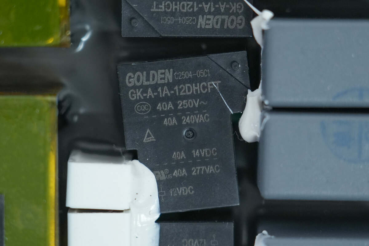 Two switching relays are from Churod, model CHC-D90/VB-12LAB. They feature a contact rating of 90 A and a coil voltage of 12 V.