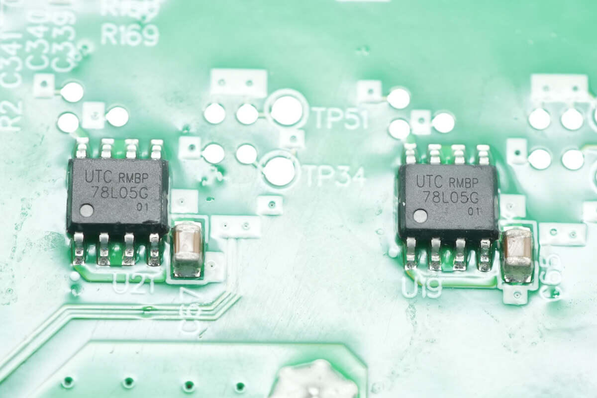 The two regulator chips are from Unisonic, model 78L05. They support a 30 V input voltage, provide a 5 V output voltage, deliver up to 100 mA of output current, and come in an SOP-8 package.