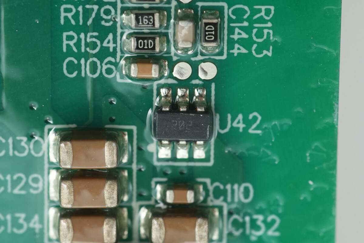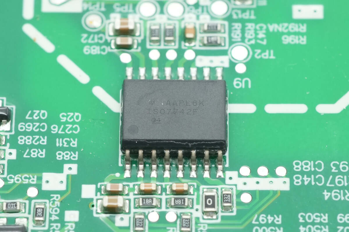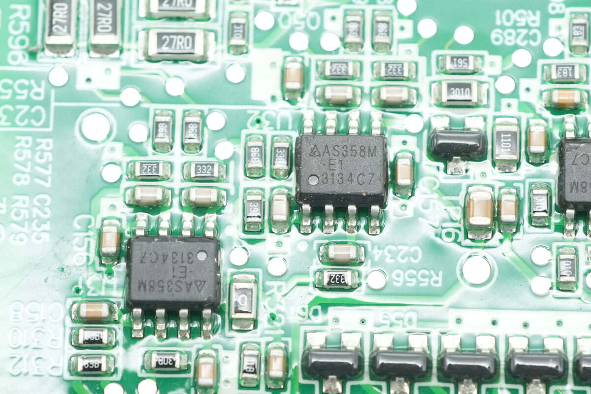 Close-up of the four DIODES AS358MTR-E1 op-amps.