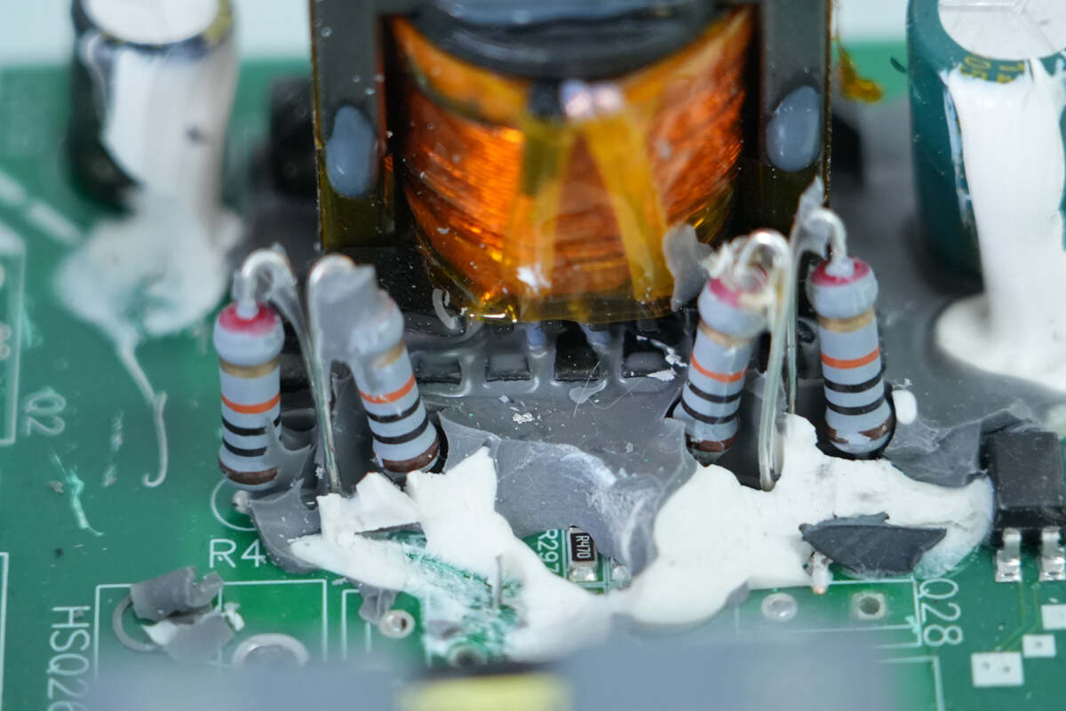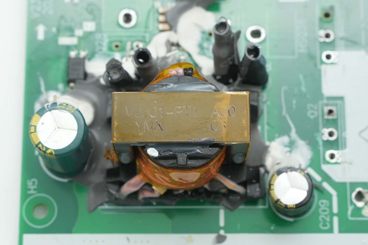 The components on one side of the transformer are wrapped with heat-shrink tubing.