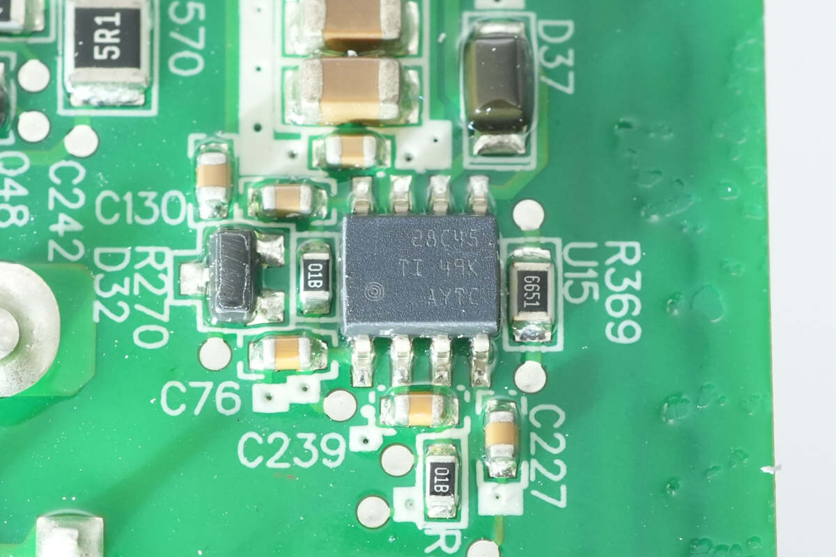 The auxiliary power supply chip is from TI, marked 28C45, model UCC28C45. It is a low-power current-mode controller supporting a 1 MHz switching frequency, housed in an SOIC-8 package.