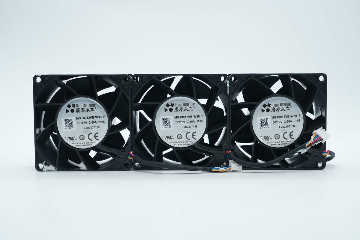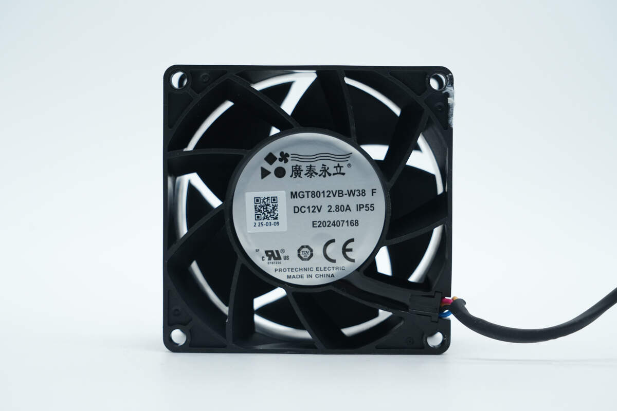 The cooling fan, model MGT8012VB-W38, is rated for DC12V 2.8A and has IP55 protection capability.
