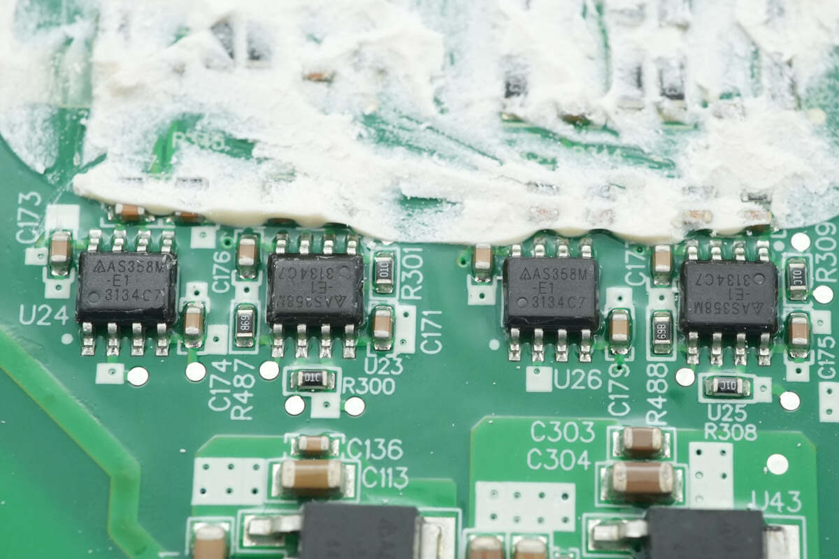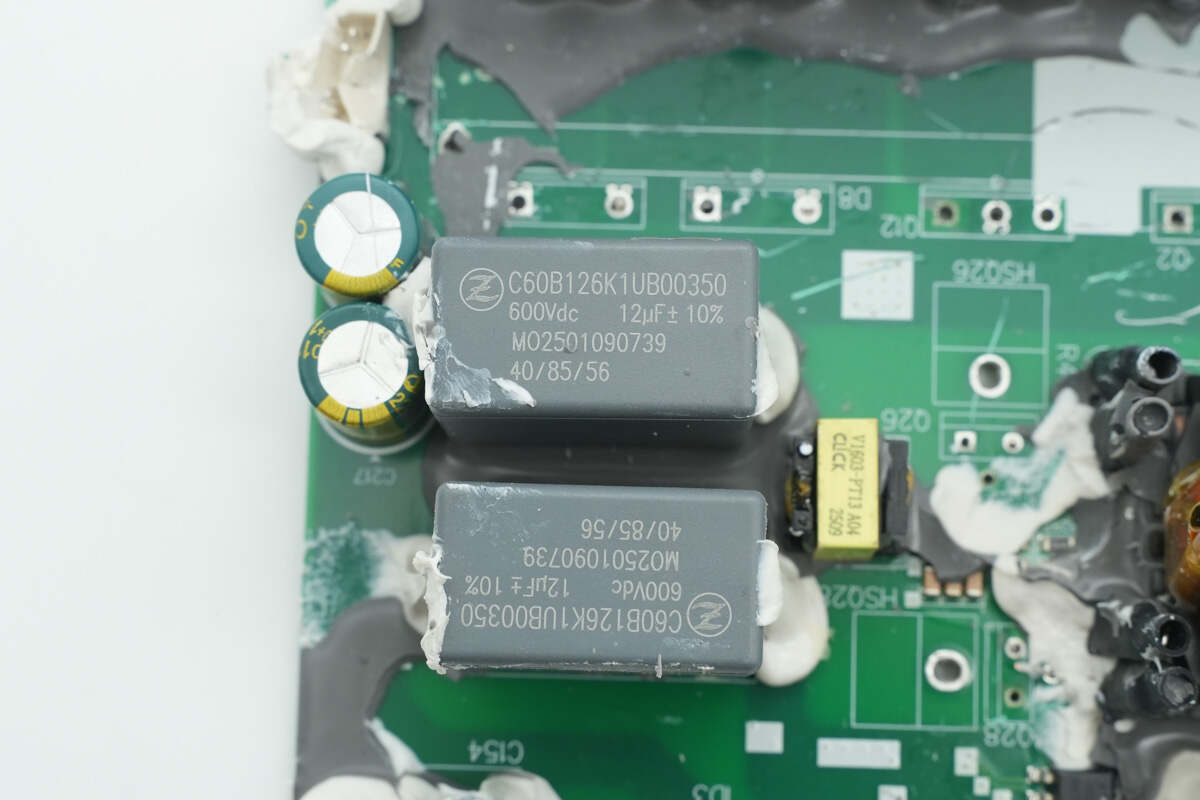 The LLC circuit uses APS ACM035P120QNN SiC MOSFETs, paired with ACD20PS120ANX and ACD40PD120AN SiC diodes for rectification. Meraki MD18624 and drivers are used for driving the PFC MOSFETs, LLC MOSFETs, and relays. The capacitors are from JD and Jianghai. The PCBA module is manufactured using an encapsulation process, with a conformal coating applied on the back side, effectively enhancing product reliability and ensuring long service life.