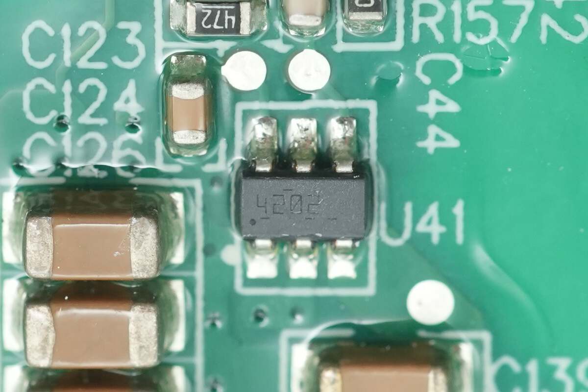 The buck chip is from TI, marked with 4202, model TPS54202. It is a synchronous buck converter with a 4.5-28V input voltage and a 2A output current, packaged in SOT23.