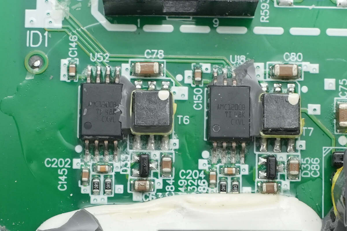 The isolation chips used for current sensing are supplied by TI, model AMC1200B. They are high-precision isolated amplifiers in an SOIC-8 package.