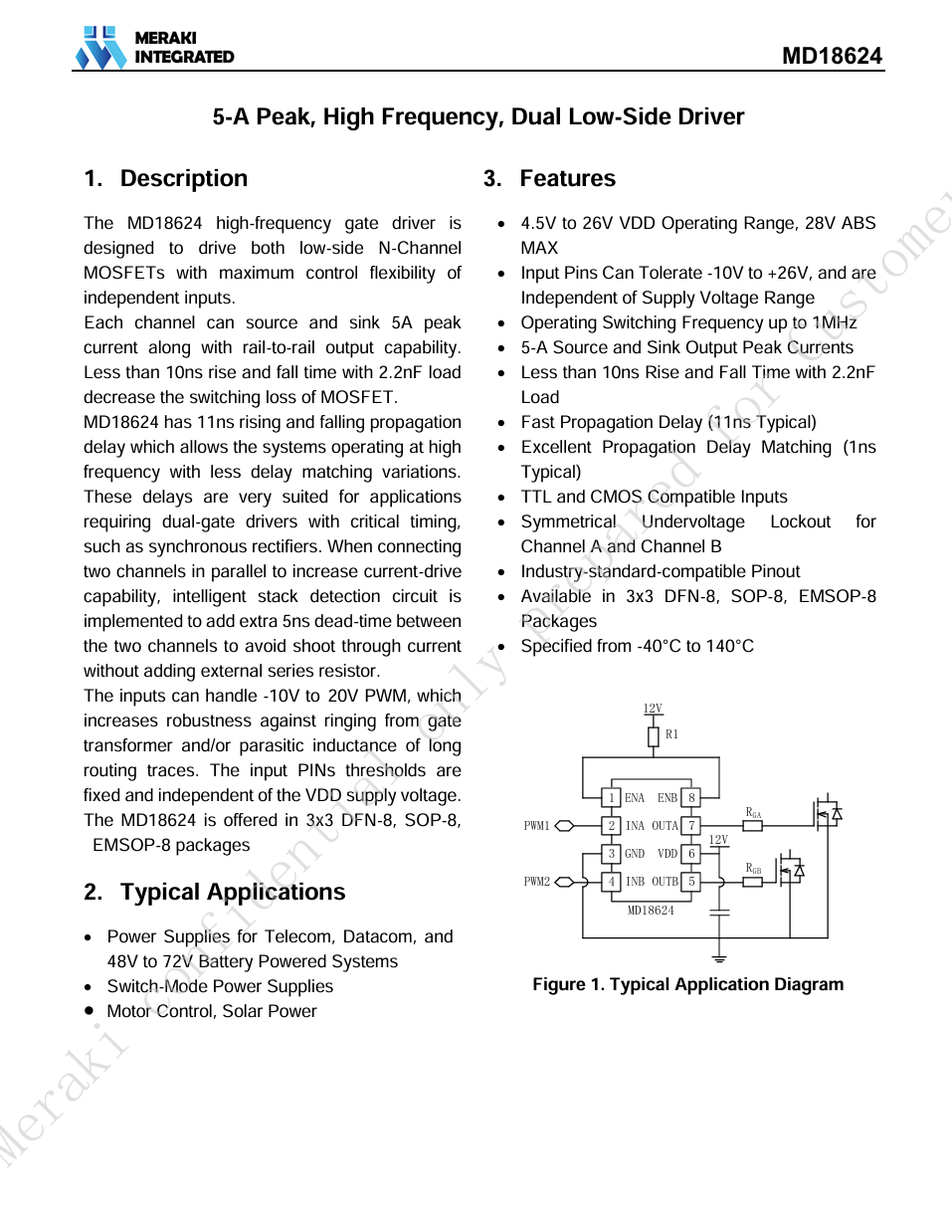 The drivers are from Meraki, model MD18624. They are dual low-side drivers with a peak drive current of 5 A, supporting a 4.5–26 V operating voltage and input pins rated for –10 to 26 V. They support switching frequencies up to 1 MHz and provide 5 A source and sink current. The devices come in an SOP-8 package, with six units used for driving the PFC MOSFETs.
