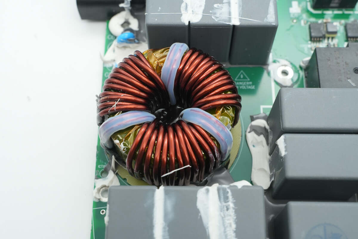 The common mode choke is wound with enameled wire, and a bakelite insulating plate is placed at the bottom.