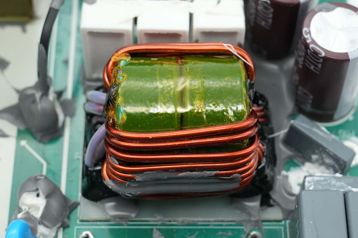 The PFC boost inductors are wound with flat copper wire, and the magnetic cores are insulated with tape. A thermistor is mounted on the heatsink on the left to monitor temperature.