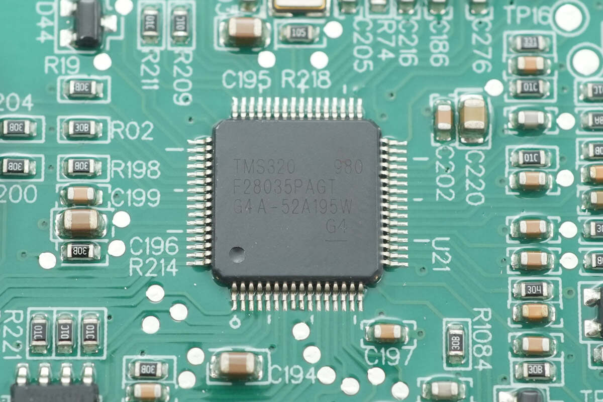 The PFC controller is from TI, part of the C2000 series of real-time microcontrollers, model TMS320F28035PAG. It features a 32-bit CPU core with a 60 MHz clock, supporting chained operations, fast interrupt response, and processing, and includes 128 KB of flash memory. It can be used in applications such as air conditioner outdoor units, DC-DC converters, inverters and motor control, onboard chargers (OBC), charging stations, and BLDC motor drives. The device comes in a TQFP-64 package.