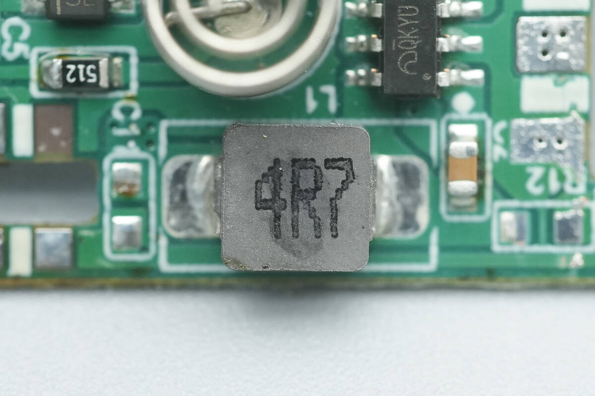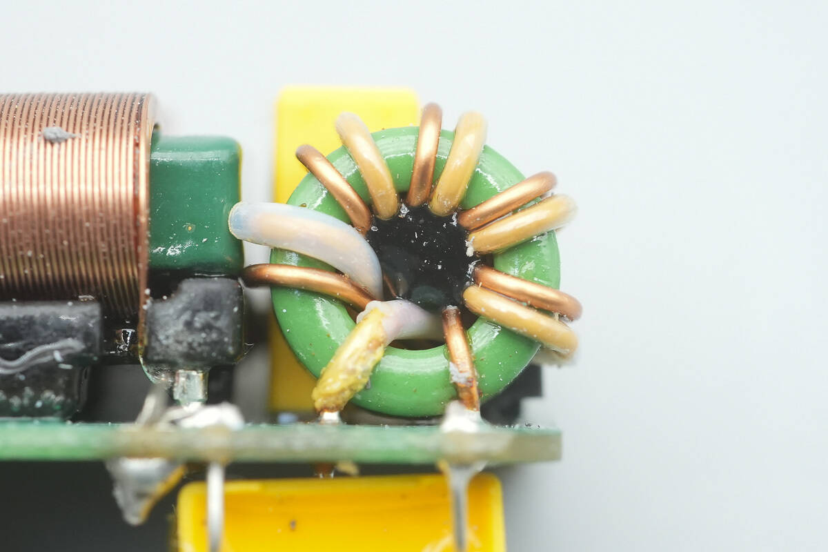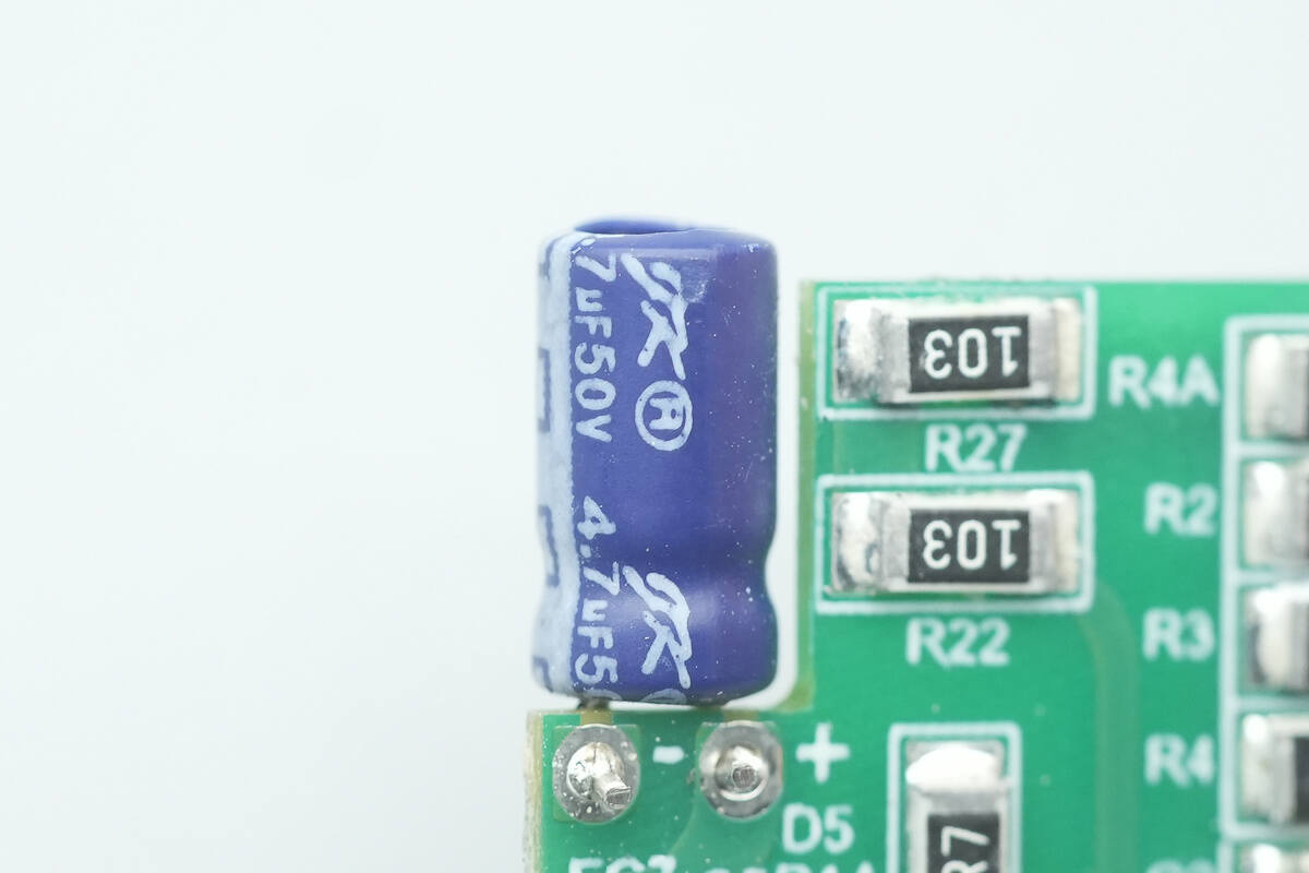 A view of the input side shows that the electrolytic capacitor at the center is covered with a yellow insulating sleeve.