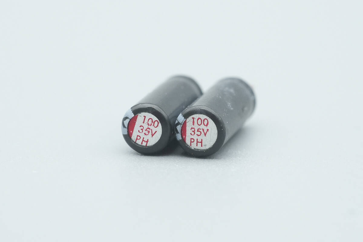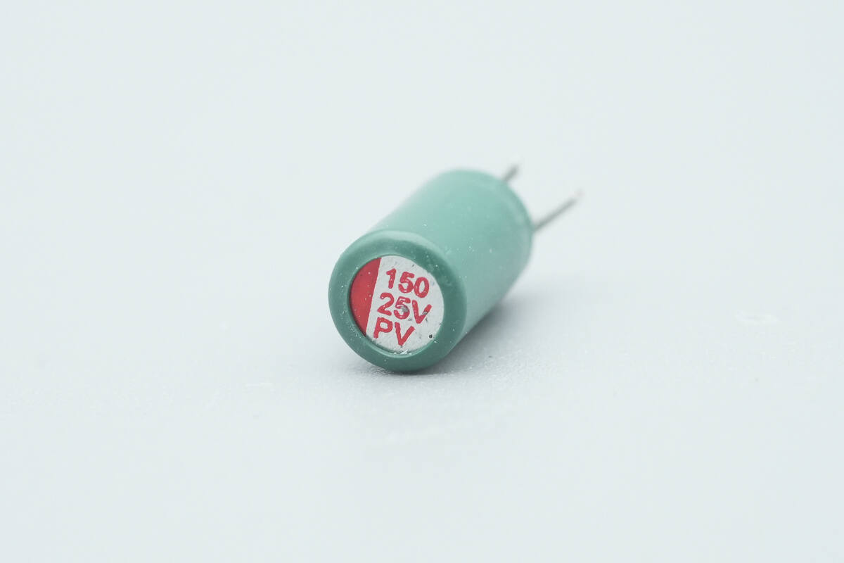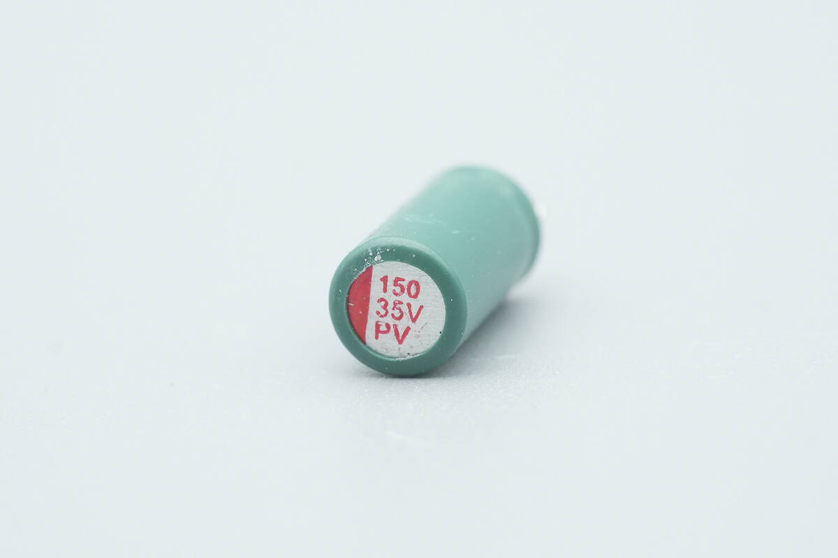 The secondary filter solid capacitors are all insulated with plastic sleeves. This one is from JSH, rated at 35 V, 150 μF.