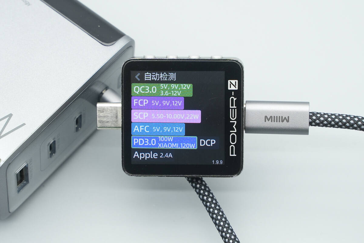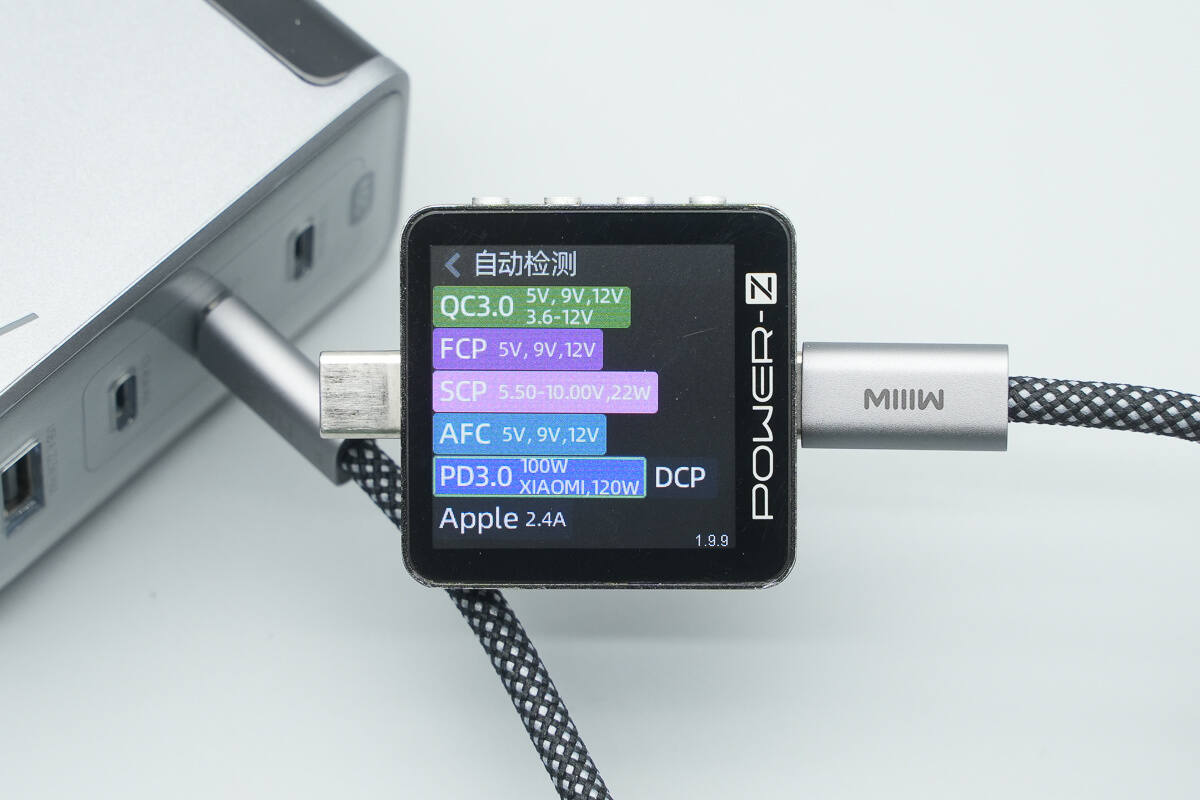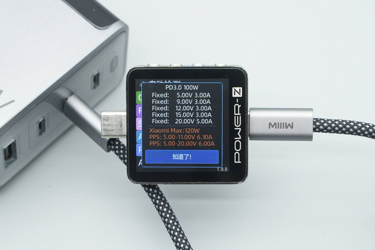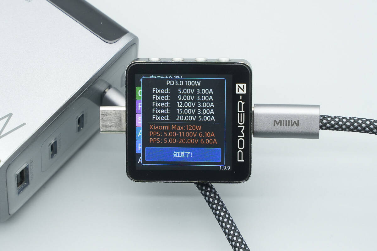 Testing confirmed that it supports two Xiaomi 120W Surge fast-charge private voltage levels: 5–11V 6.1A and 5–20V 6A.