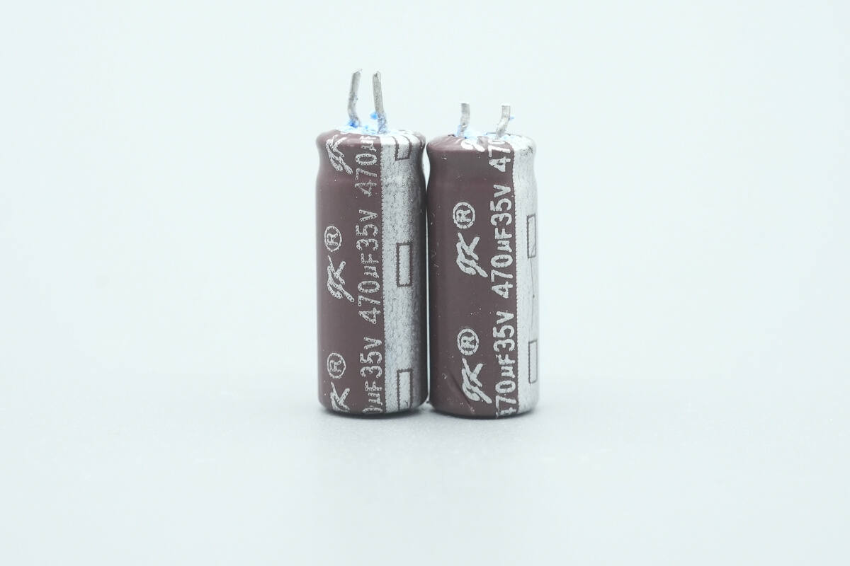 These two capacitors are from JK, each rated at 470 μF, 35 V.