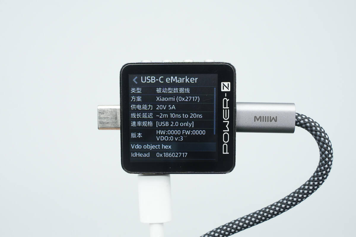 ChargerLAB POWER-Z KM003C shows it has an E-Marker chip. Its power transmission capability is 20V5A, while its data transfer capability is USB 2.0. Therefore, the cable is compatible with 100W PD fast charging and Xiaomi’s 120W Surge fast charging. To achieve 140W PD 3.1 fast charging, a separate cable is required.