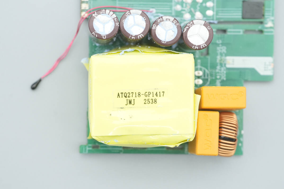 After removing all the small PCBs, the front side of the main board still has the transformer, electrolytic capacitors for output filtering, and a thermistor.
