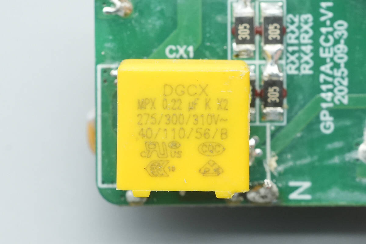 The safety X2 capacitor is from DGCX with a capacitance of 0.22 μF.