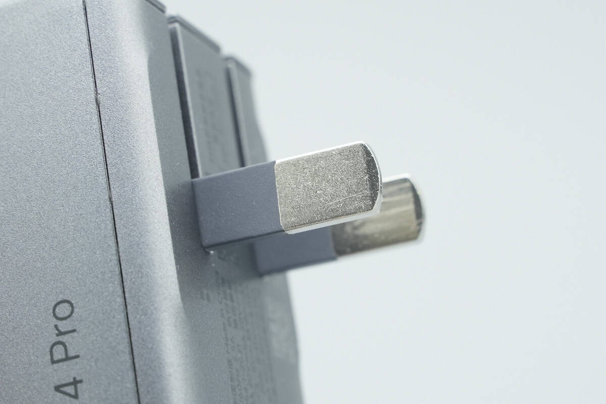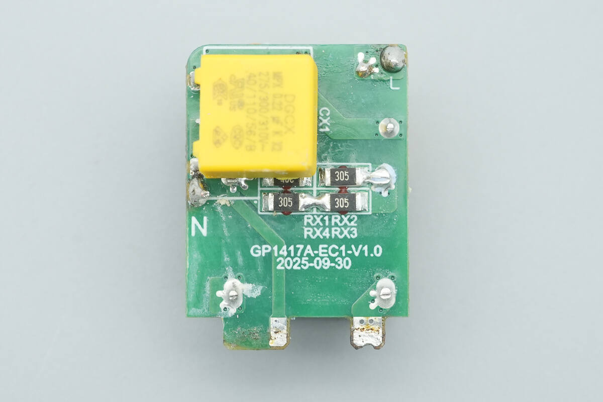 Open the bottom case. The plug prongs are connected to the PCBA module via wires. The prongs are covered with a Mylar sheet for insulation.