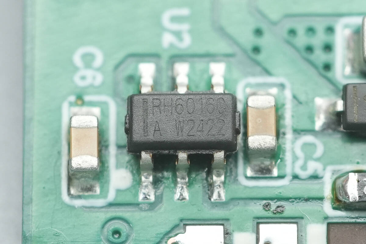The touch-sensing chip is model RH6016C. It features a single-channel capacitive input with a built-in voltage regulator, high-precision voltage stabilization, power-on reset and low-voltage reset, as well as hardware debounce and other anti-interference measures.