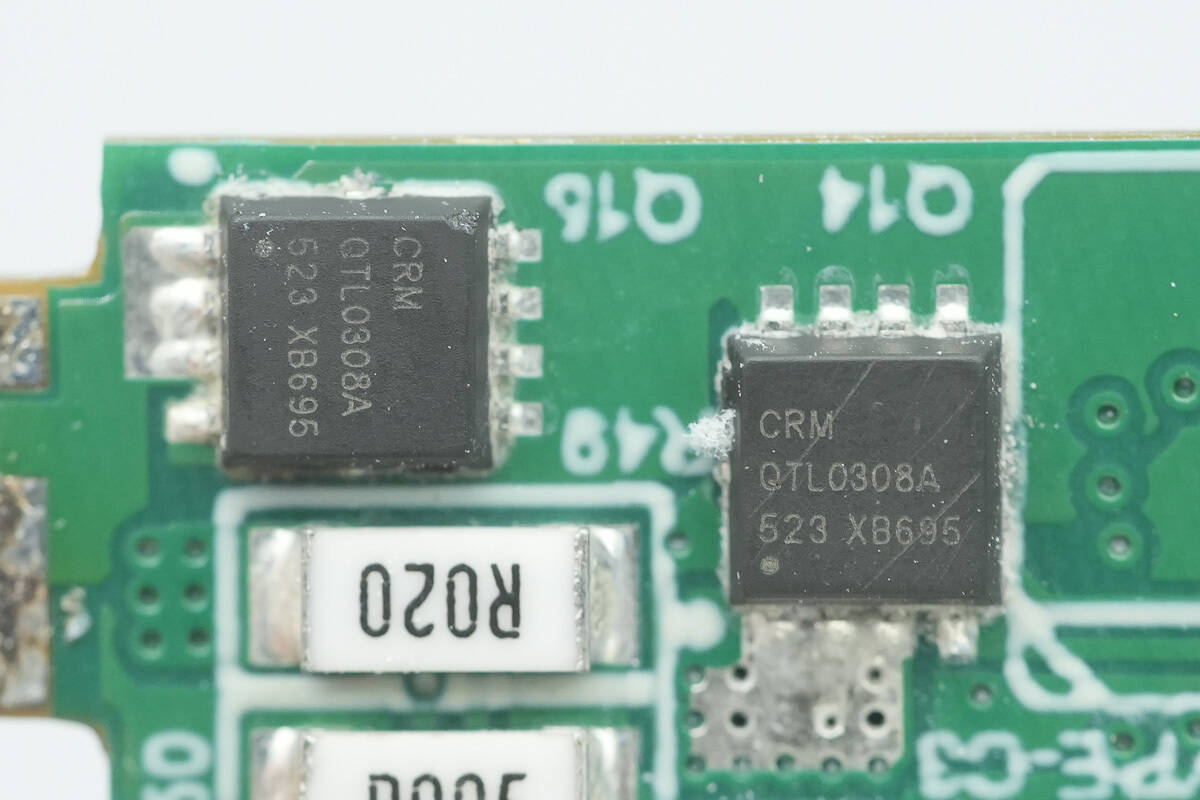 The VBUS MOSFETs for the USB-C3 and USB-A ports are from CRM, model CRMQTL0308A. They are NMOS transistors with a voltage rating of 30 V and an on-resistance of 6.2 mΩ, packaged in PDFN 3.3×3.3-8L.