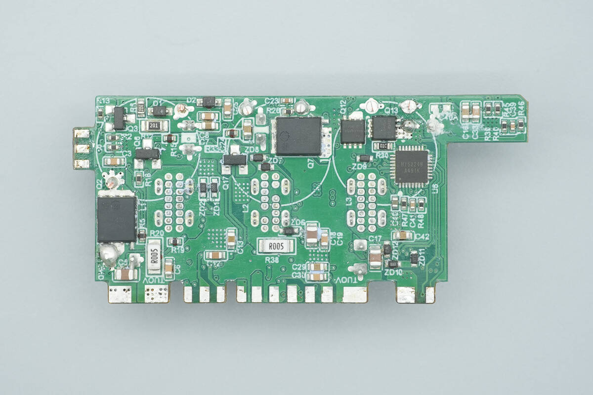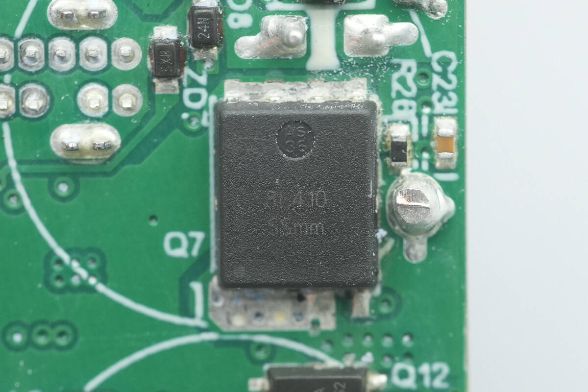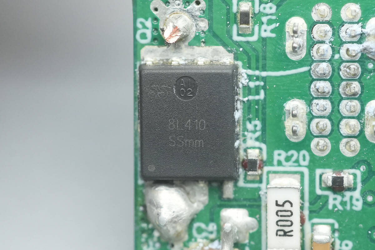 After removing the inductors, the PCB still has synchronous buck MOSFETs and a protocol chip.