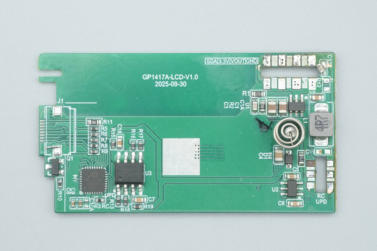 The front side of another small PCB houses an MCU, memory, a synchronous buck converter, a buck inductor, and a touch-sensing chip, among other components.