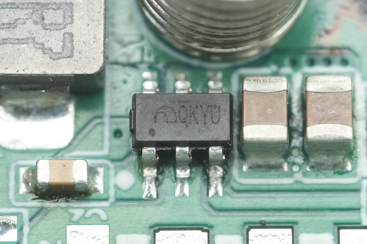 The synchronous buck converter used for step-down power supply is marked QKYU.