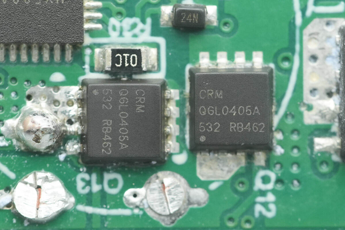 The two synchronous buck MOSFETs paired with it are from CRM, model CRMQGL0405A. They are NMOS transistors with a voltage rating of 40 V, packaged in PDFN 3.3×3.3-8L.