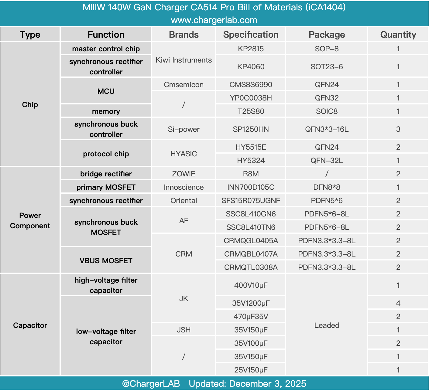 Here is the component list of the MIIIW 140W GaN Charger CA514 Pro for your convenience.