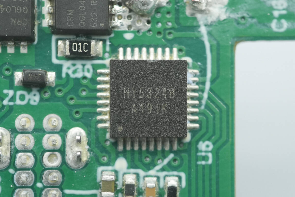 The protocol chip for the other two ports is from HYASiC, model HY5324. This is a high-performance, highly integrated multi-port USB fast-charging controller. It supports seven programmable PDOs and is compatible with BC1.2 DCP, Apple 2.4 A, QC2.0/QC3.0/QC3.0+, AFC, FCP, SCP, UFCS, and PE+ 1.1/2.0 protocols.