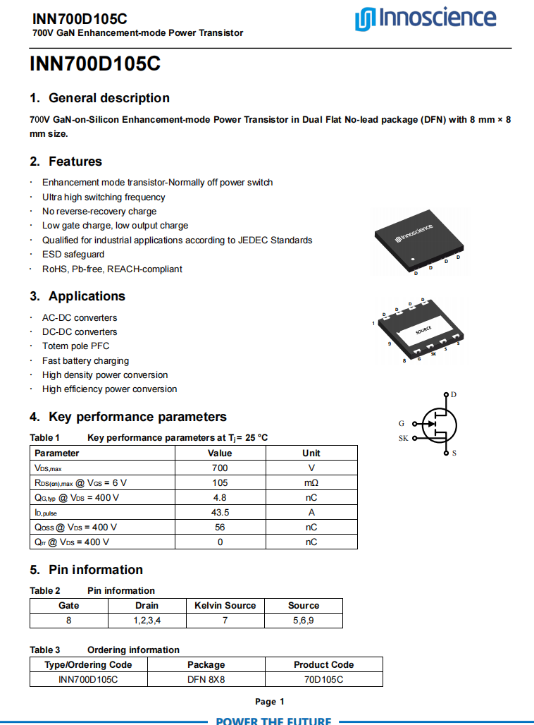 The primary MOSFET is from Innoscience, model INN700D105C. It is a 700 V enhancement-mode GaN transistor with an on-resistance of 105 mΩ. The device supports ultra-high switching frequencies, has zero reverse-recovery charge, and features very low gate and output capacitances. It meets JEDEC industrial application standards, includes built-in ESD protection, and complies with RoHS, lead-free, and EU REACH regulations. It is suitable for high-efficiency, high-density applications such as AC-DC and DC-DC conversion and comes in a DFN 8×8 package.