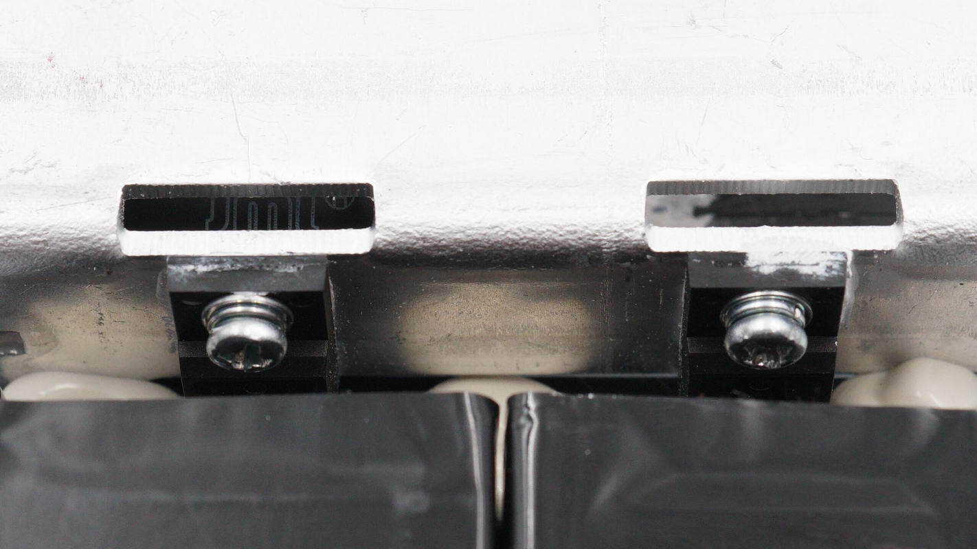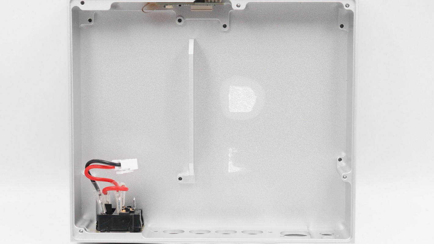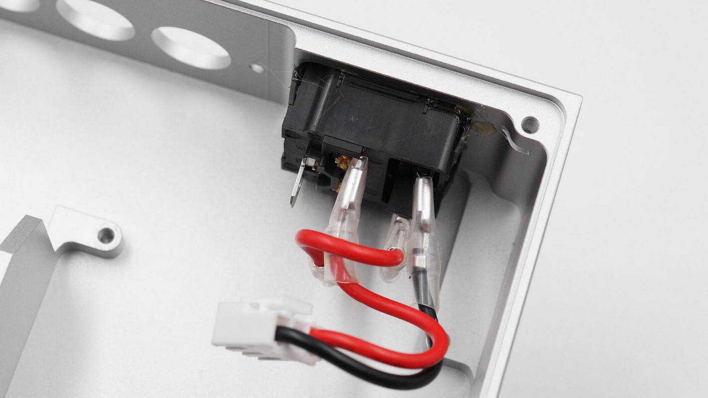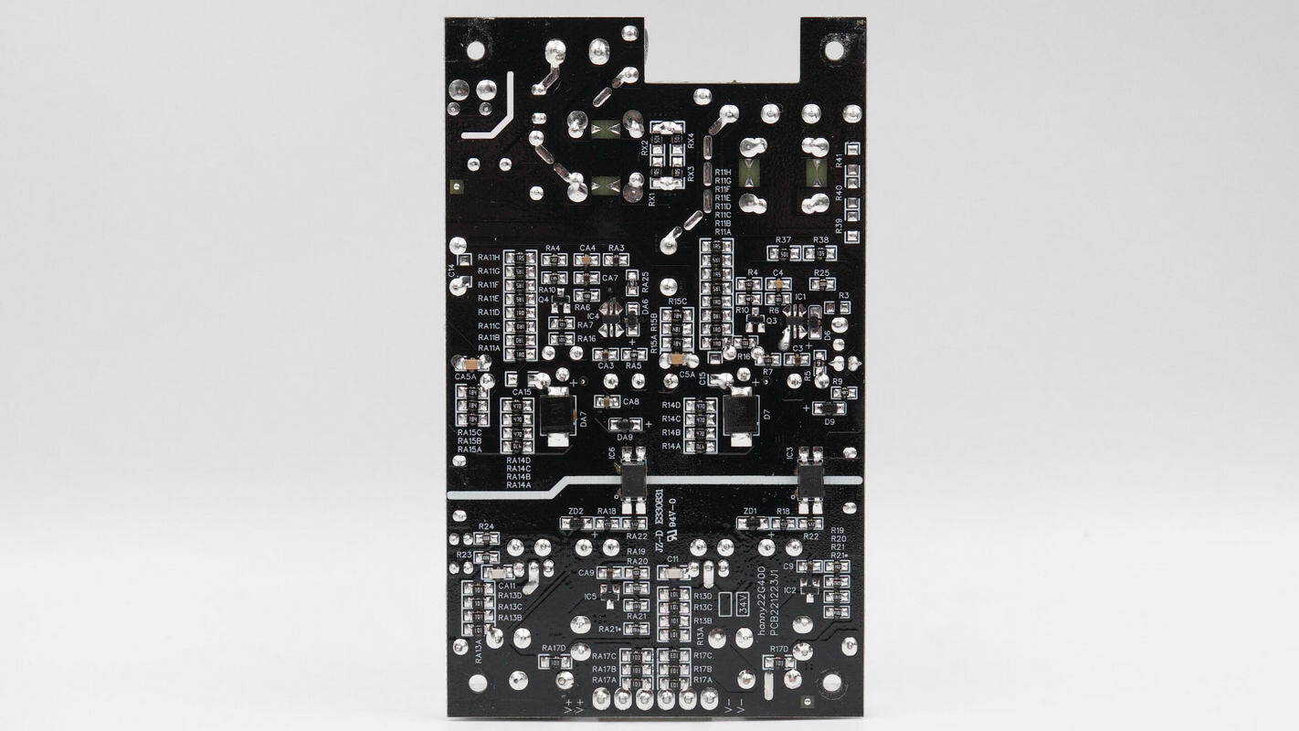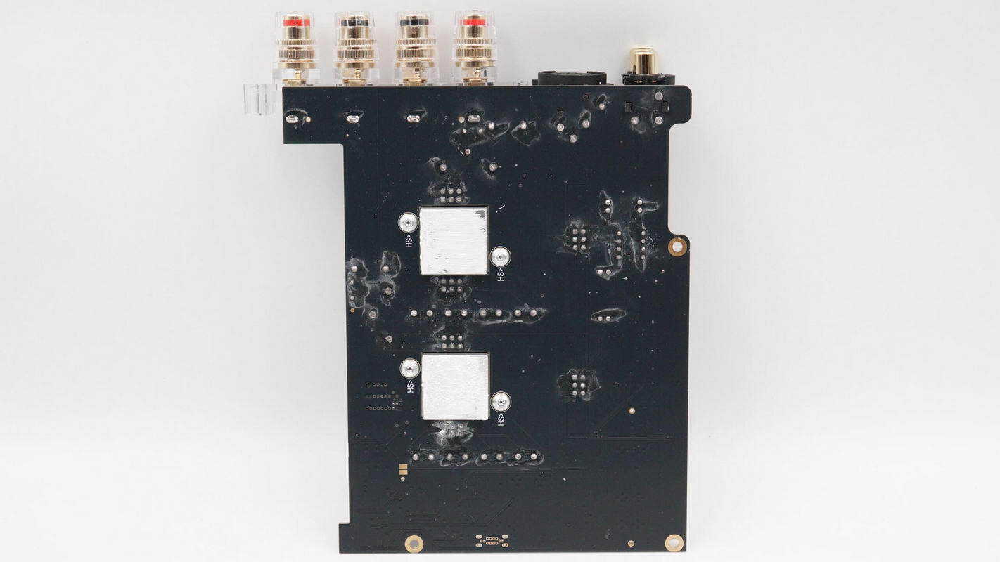 On the underside of the GaN amplifier PCB, a thermal pad and an aluminum block are installed. A partition separates the power supply module and amplifier module, and HONGFA relays are used for audio signal switching. The build quality is solid, with reliable components.