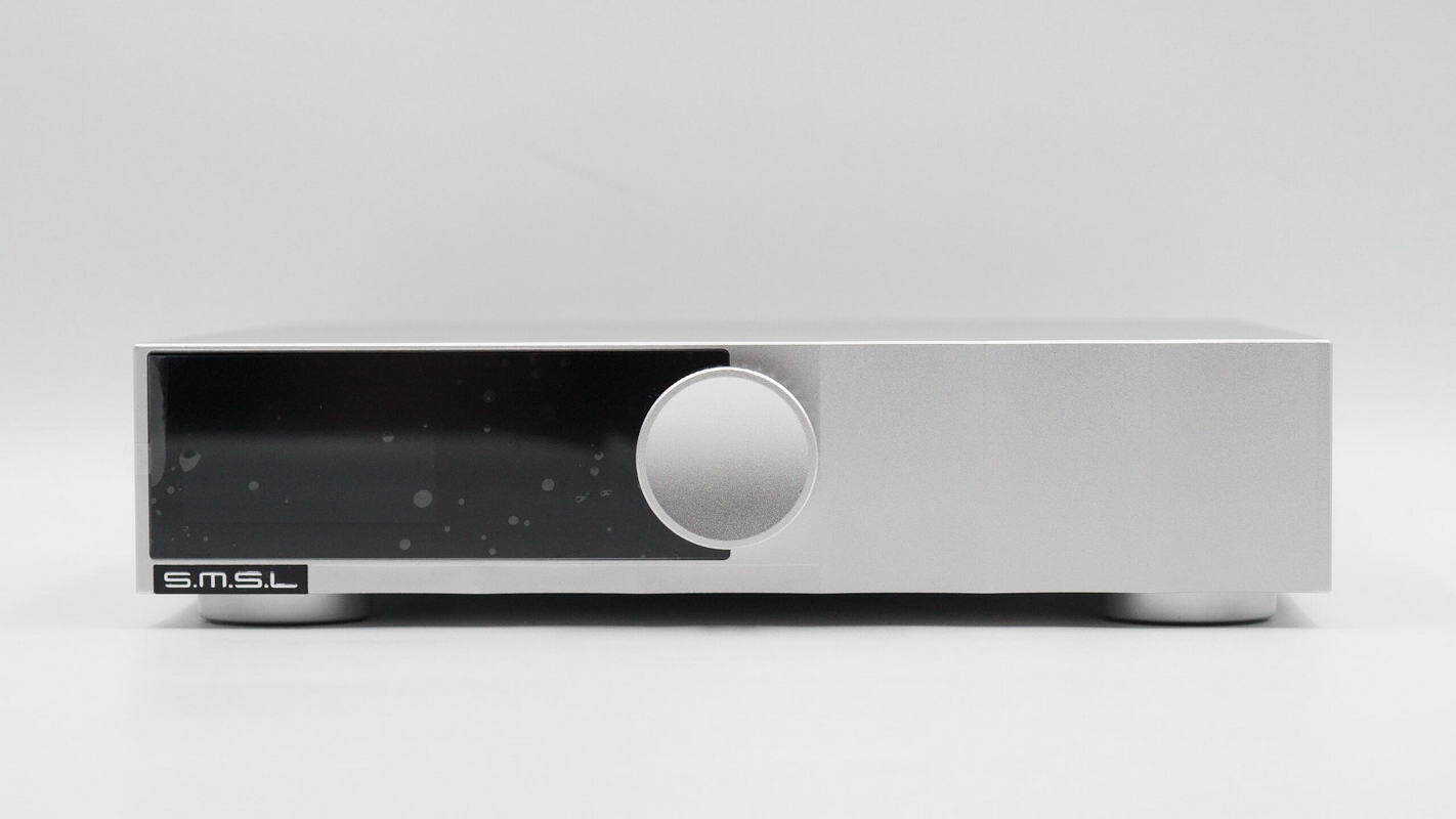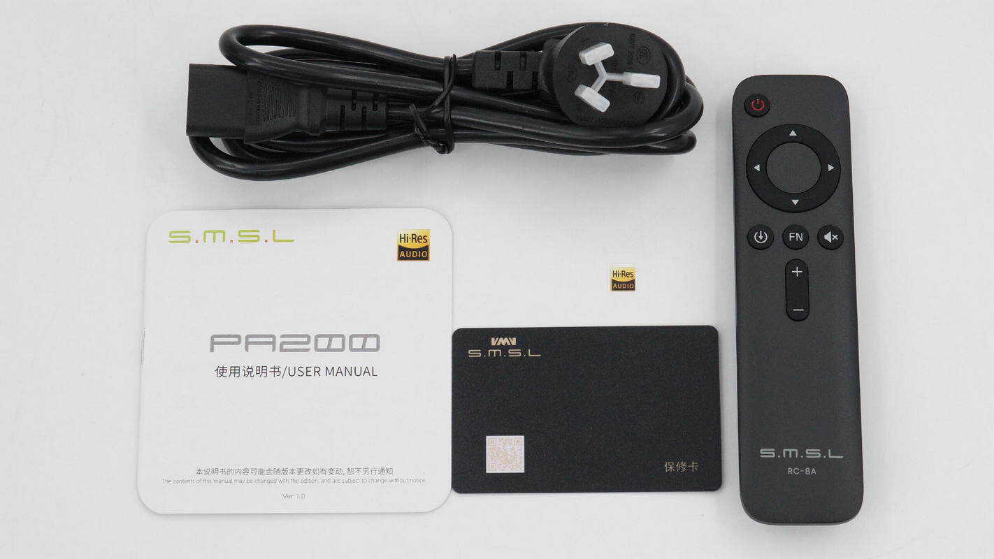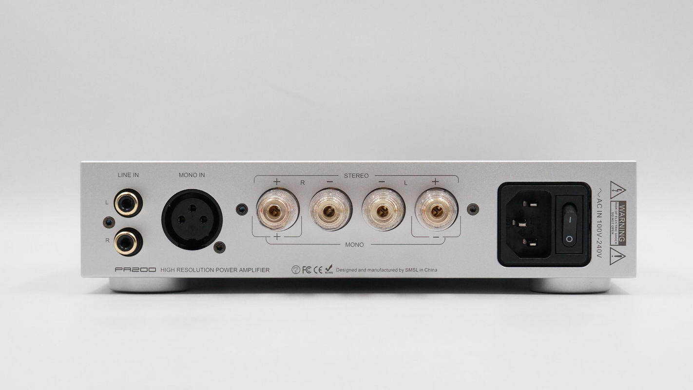 We have procured a GaN power amplifier released by SMSL, model PA200. It features a full aluminum alloy chassis, a front display with a function knob, and an infrared remote control for convenient volume adjustment. The rear panel includes audio input jacks, speaker outputs, and a power input connector.