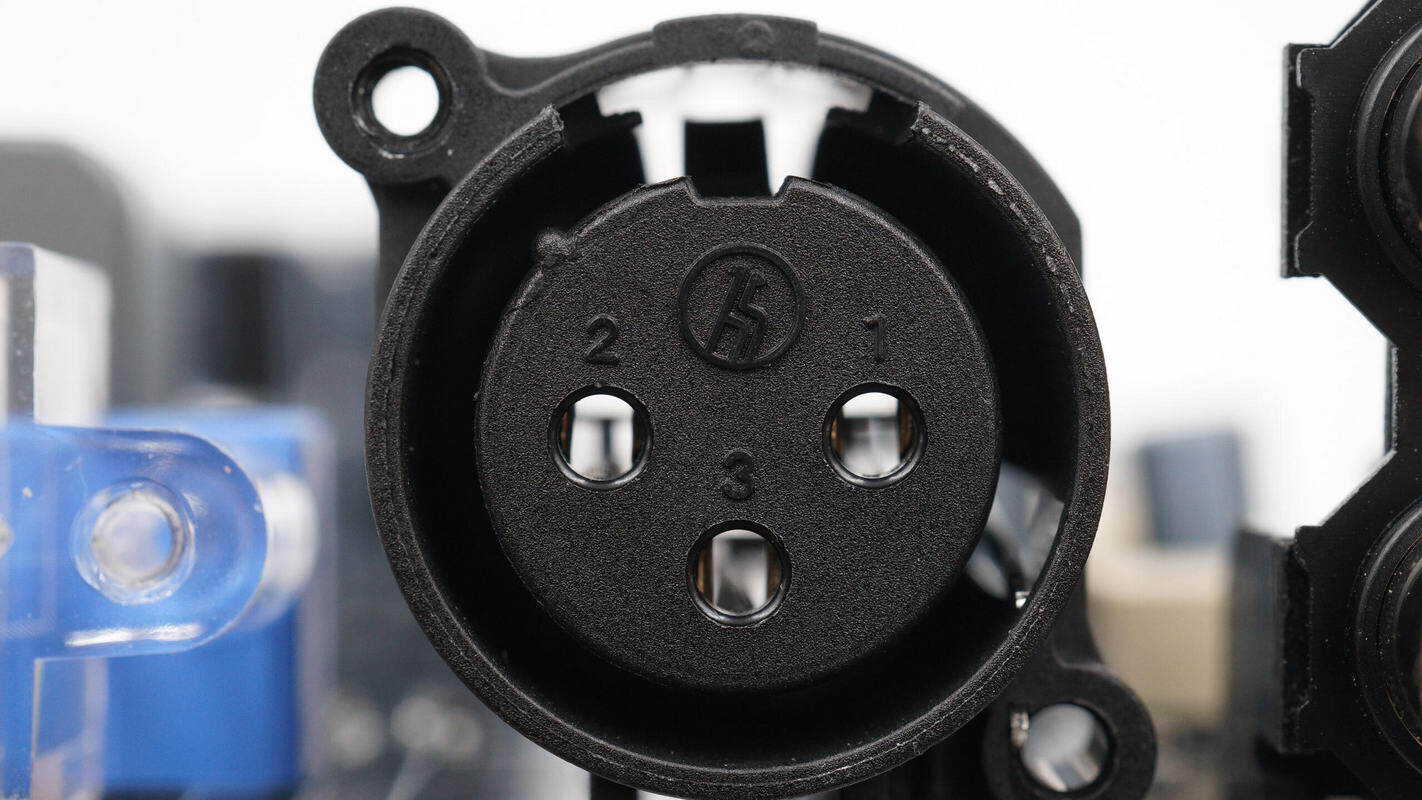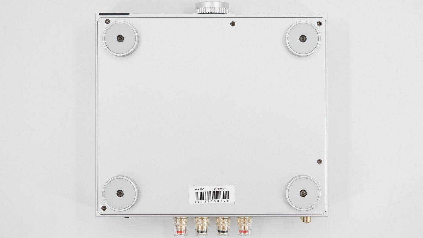 On the rear panel, there are line-level input jacks, an XLR input, amplifier output binding posts, and a power input connector.