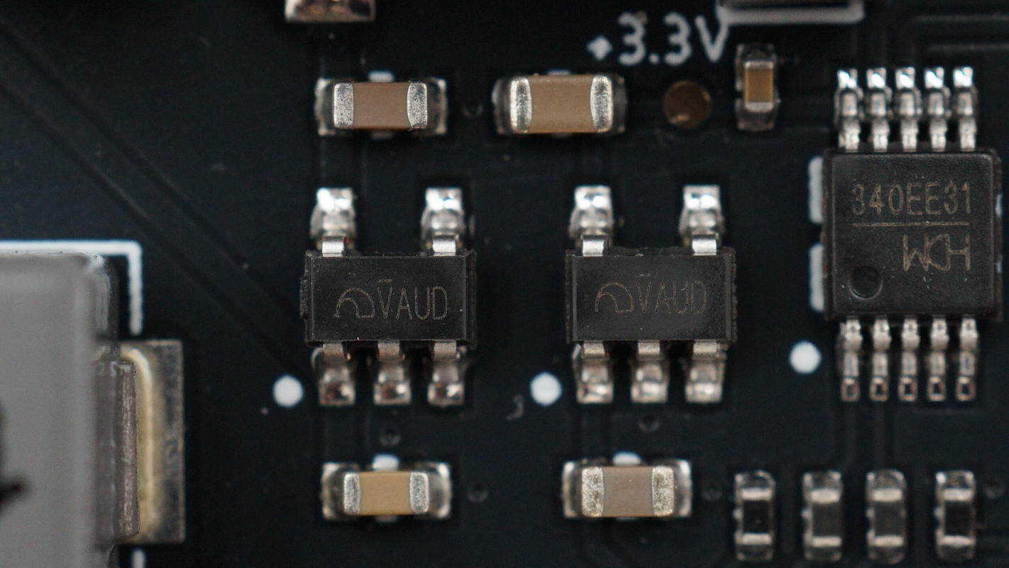 The regulator chips are from Microne, marked VAUD, and come in SOT23 packages.