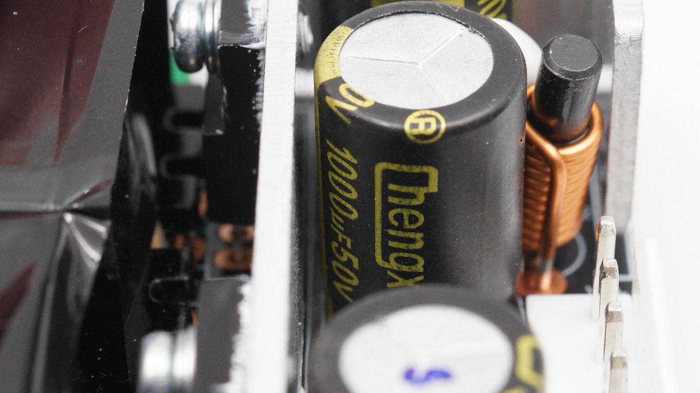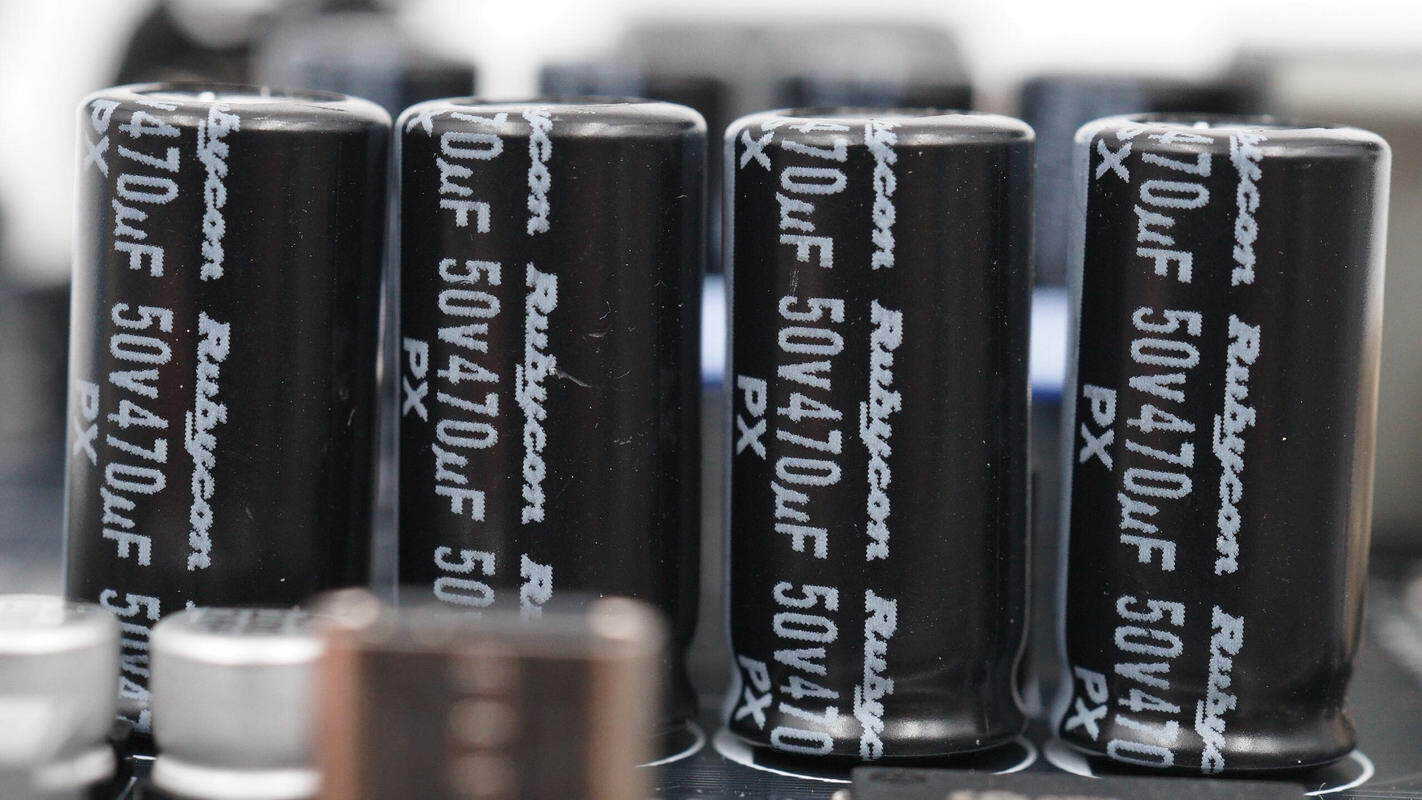 The filter capacitors are from Rubycon, each rated at 470 μF, 50 V, with a total of eight units used.