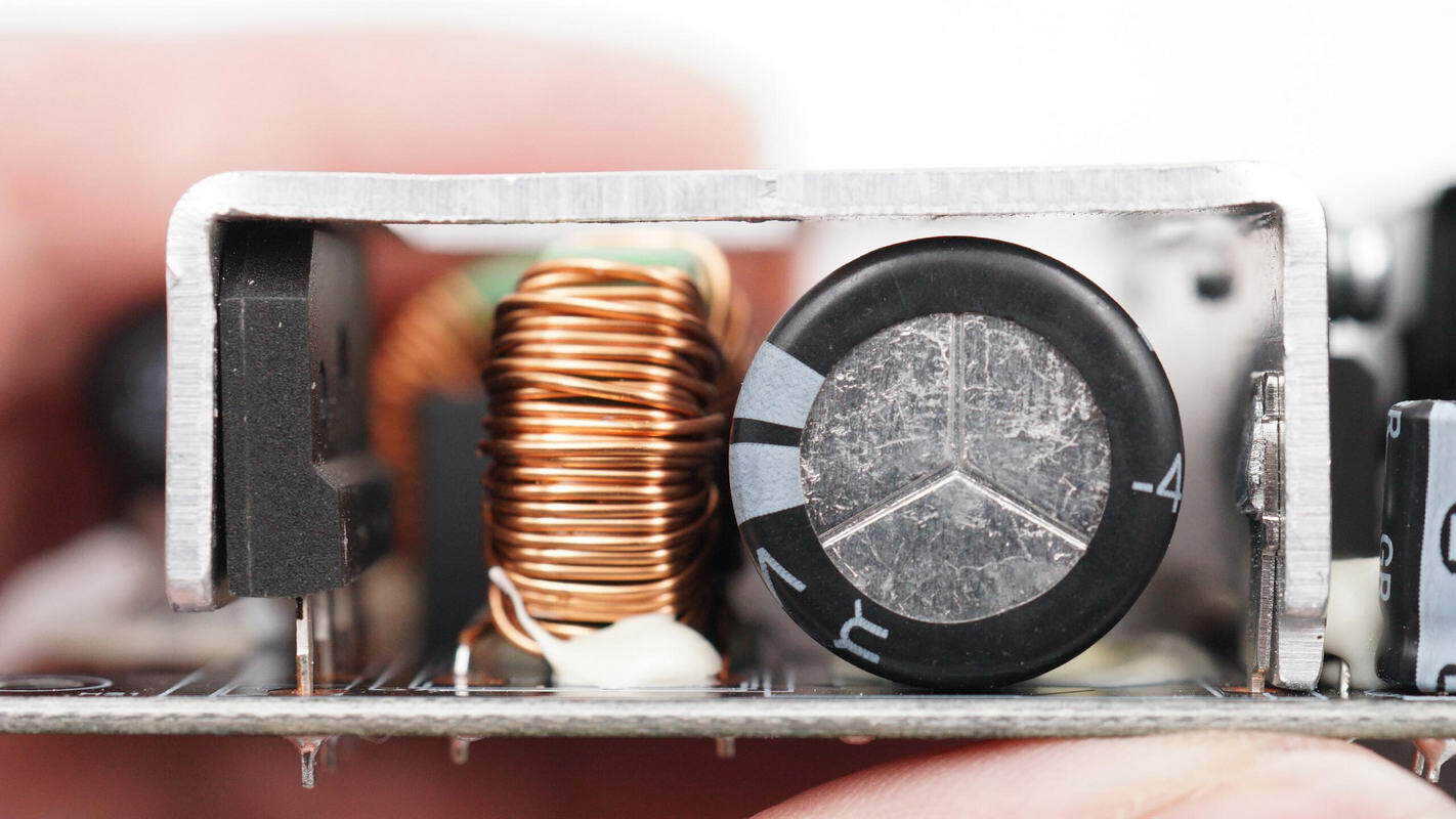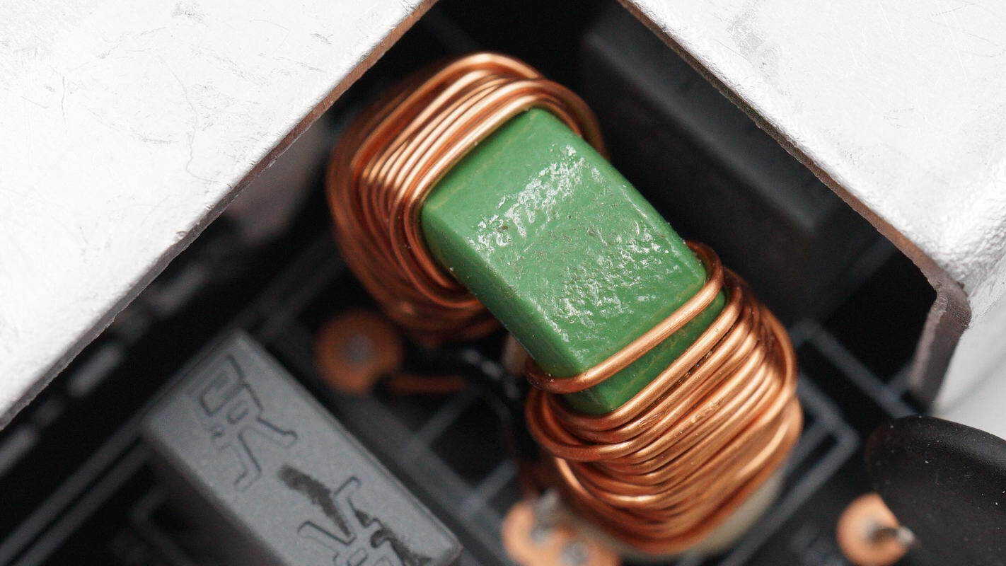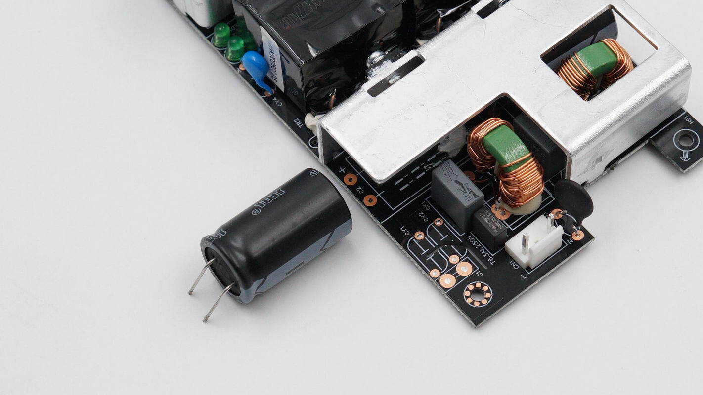 Beneath the heatsink are the bridge rectifier, common mode choke, and a high-voltage filter capacitor.