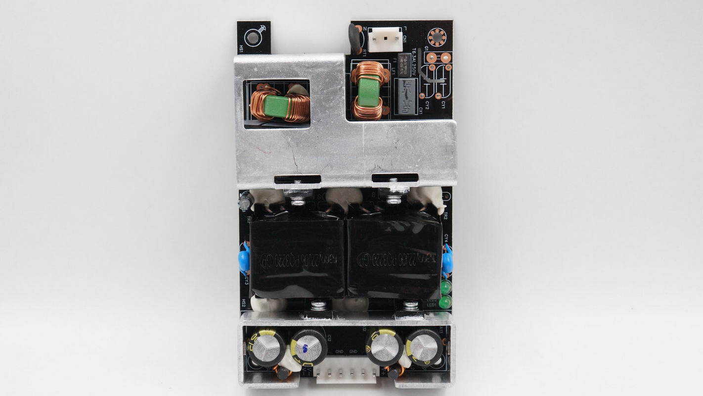 The front side of the switching power supply module includes a fuse, safety X2 capacitor, common mode choke, primary MOSFETs, bridge rectifier, high-voltage filter capacitors, transformers, and rectifiers.