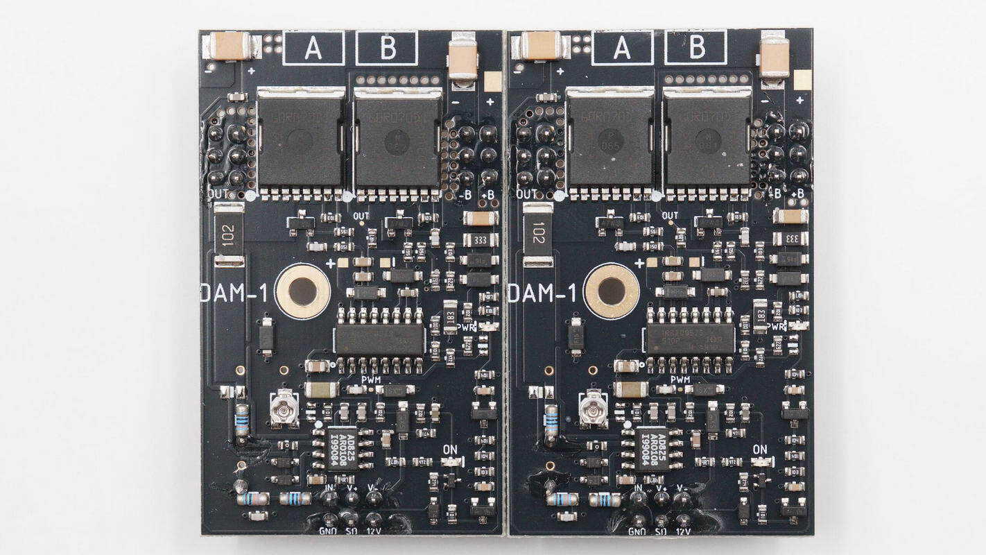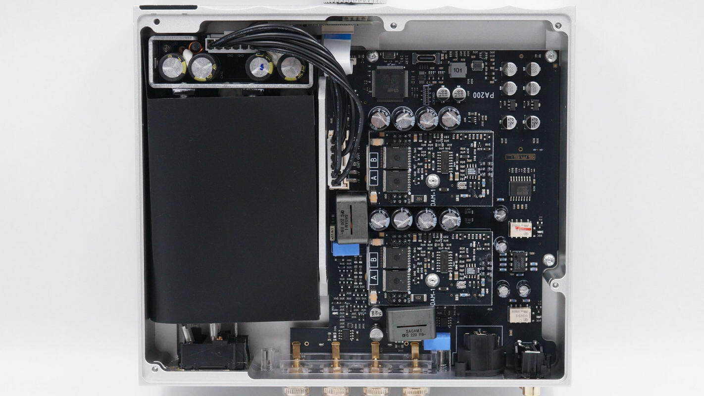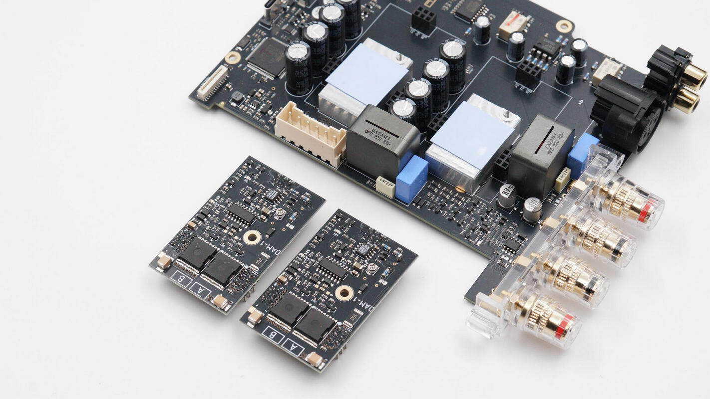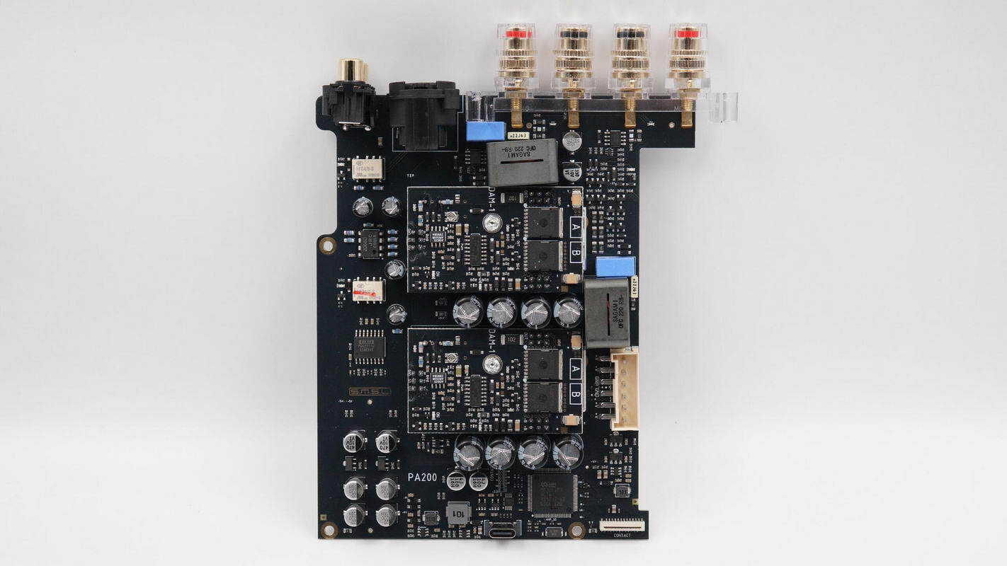 The front side of the amplifier module features relays, a digital potentiometer, regulator chips, filter capacitors, an MCU, and other components.