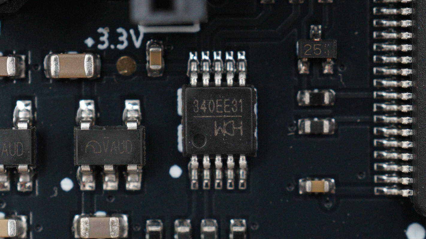 The serial interface converter chip is from WCH, model CH340E. It is used for USB-to-serial or USB-to-printer conversion, features a full-speed USB device interface, is compatible with USB 2.0, supports 5V and 3.3V power supply, and comes in an MSOP10 package.