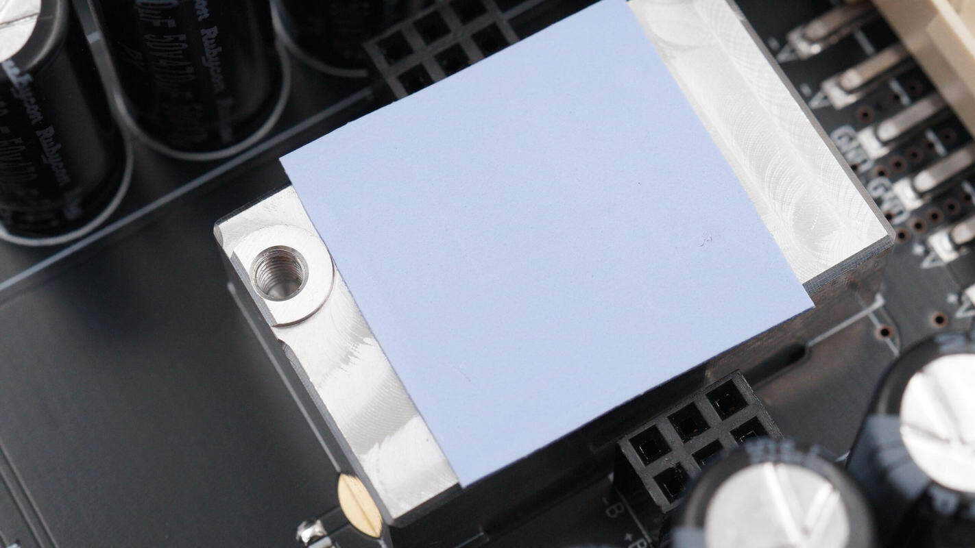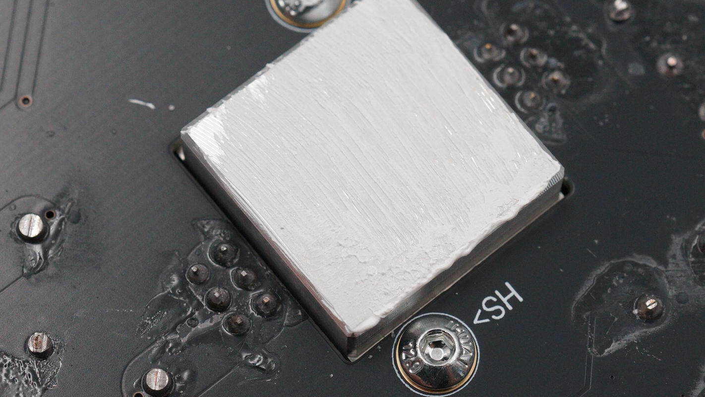 Beneath the GaN amplifier module, a thermal pad and heatsink block are installed and secured with screws.