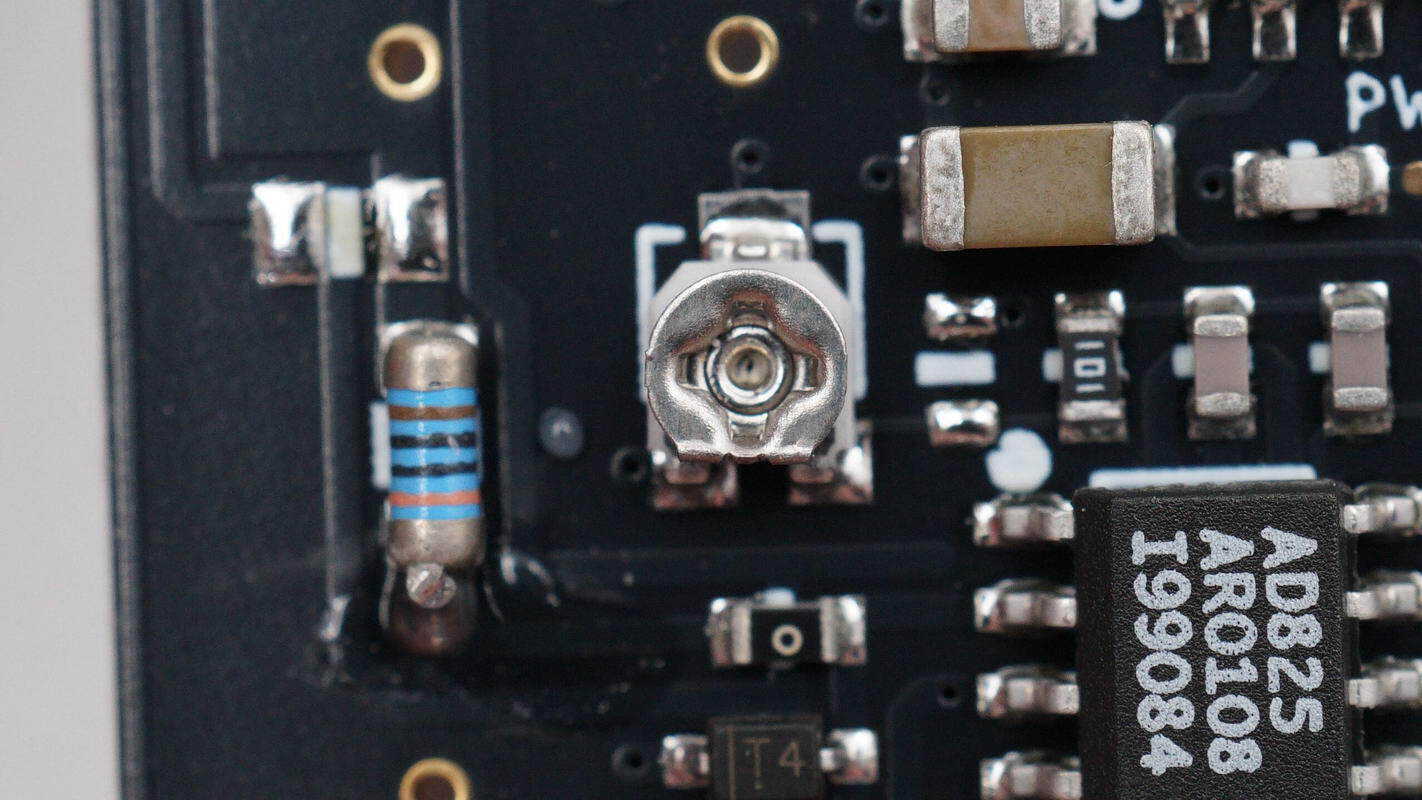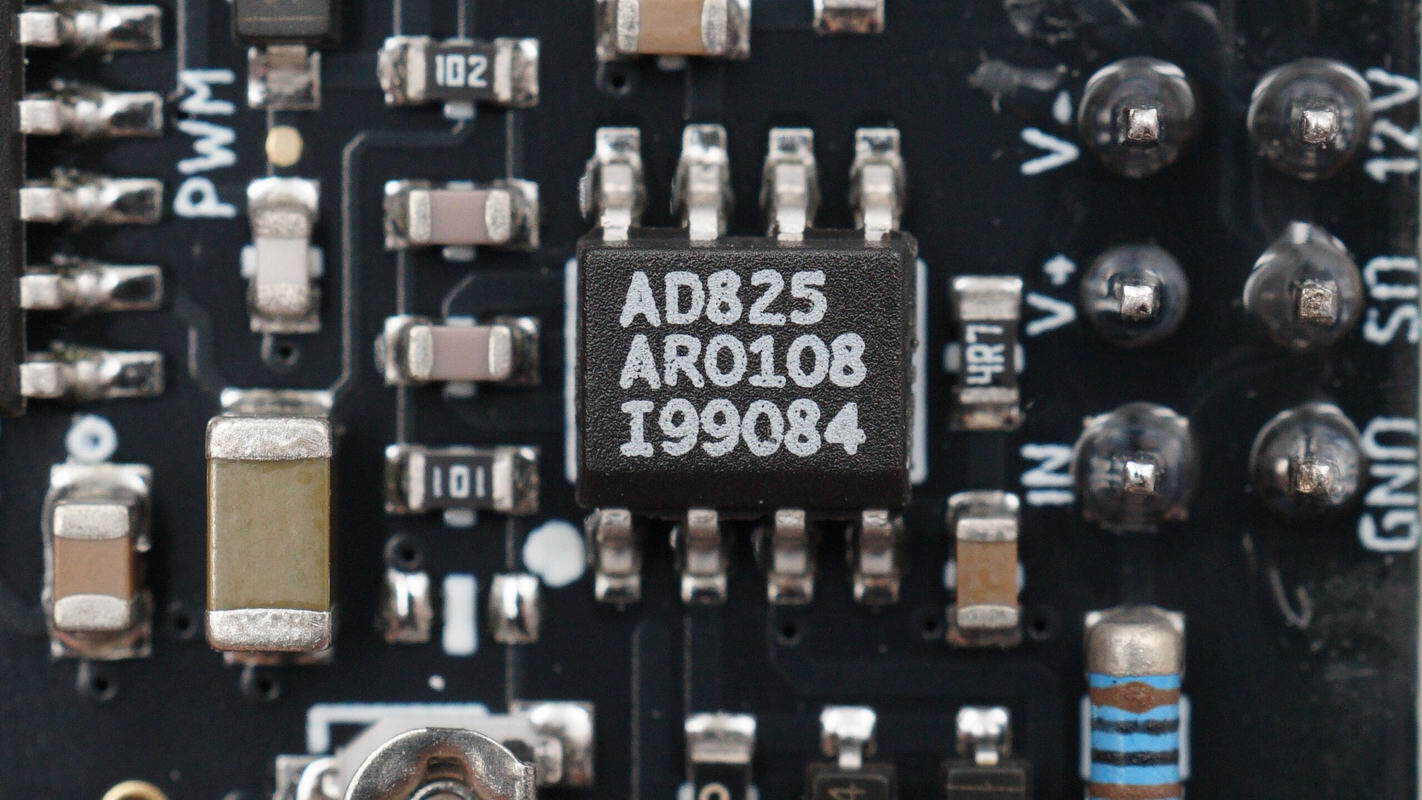 The operational amplifier is from ADI, model AD825. It is a general-purpose high-speed JFET amplifier, supporting a ±5 V to ±15 V supply voltage, with a slew rate of 125 V/μs and high output drive capability. It comes in an SOIC-8 package.