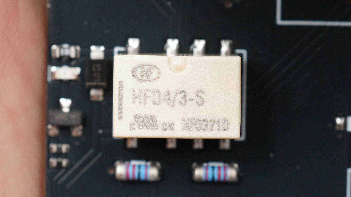 The switching relay is from HONGFA, model HFD4/3‑S. It is an ultra-compact fourth-generation signal relay with a contact rating of 2 A, 30 V DC, and comes in a standard surface-mount package.