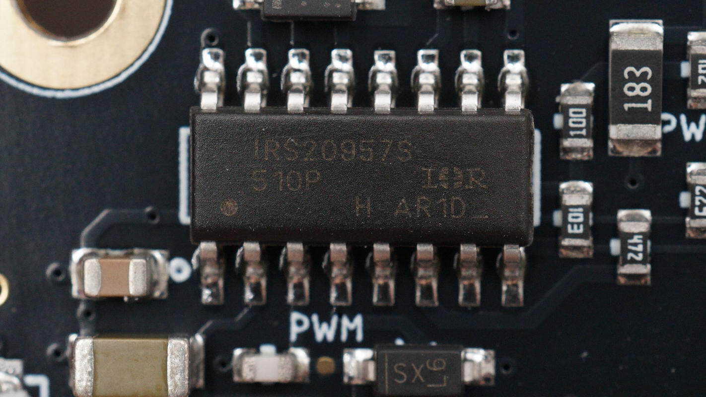 The driver is from Infineon, model IRS20957S. It is a high-voltage, high-speed MOSFET driver featuring floating PWM inputs, a switching frequency of up to 800 kHz, and support for ±100 V supply voltage. It offers high noise immunity, dual overcurrent and shoot-through protection, as well as undervoltage lockout for the bias supply, and comes in an SOIC-16 package.