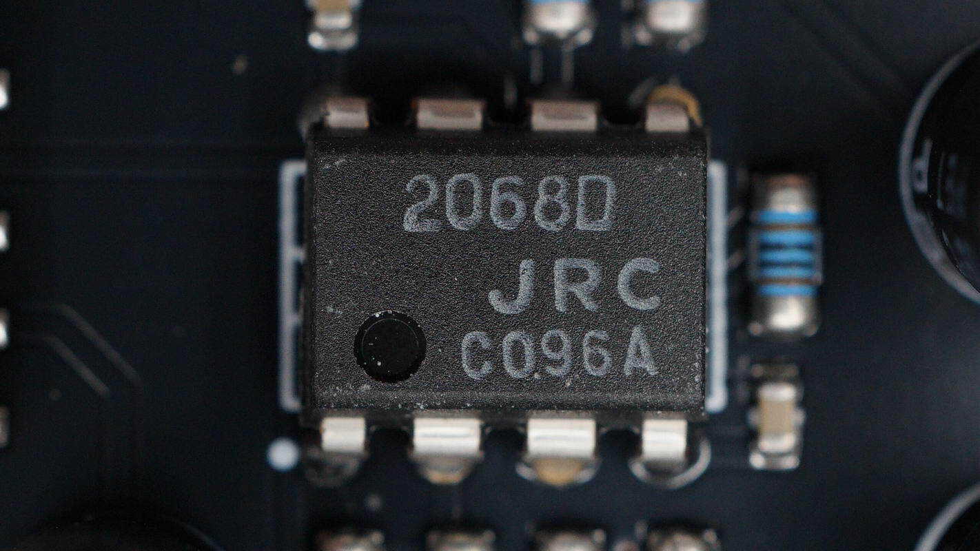 The operational amplifier is from NISSHINBO, model NJM2068D. It is a low-noise dual op-amp, supporting a ±4 V to ±18 V operating voltage, and comes in a DIP8 package.