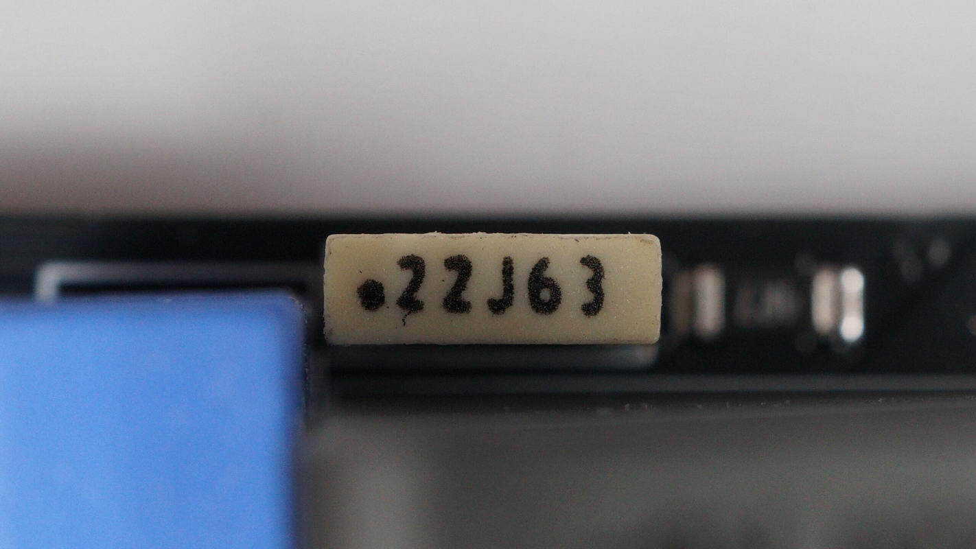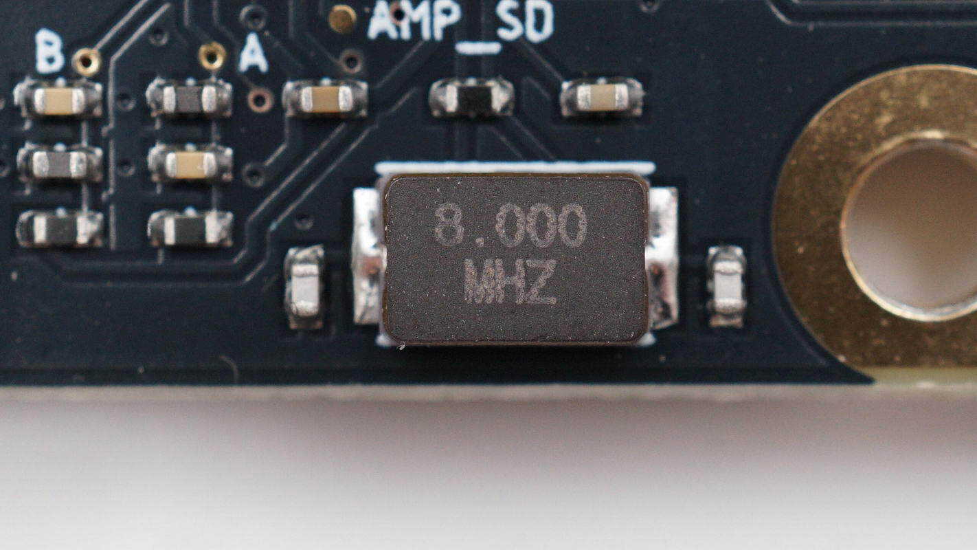 Close-up of the external 8.000 MHz crystal oscillator connected to the MCU.