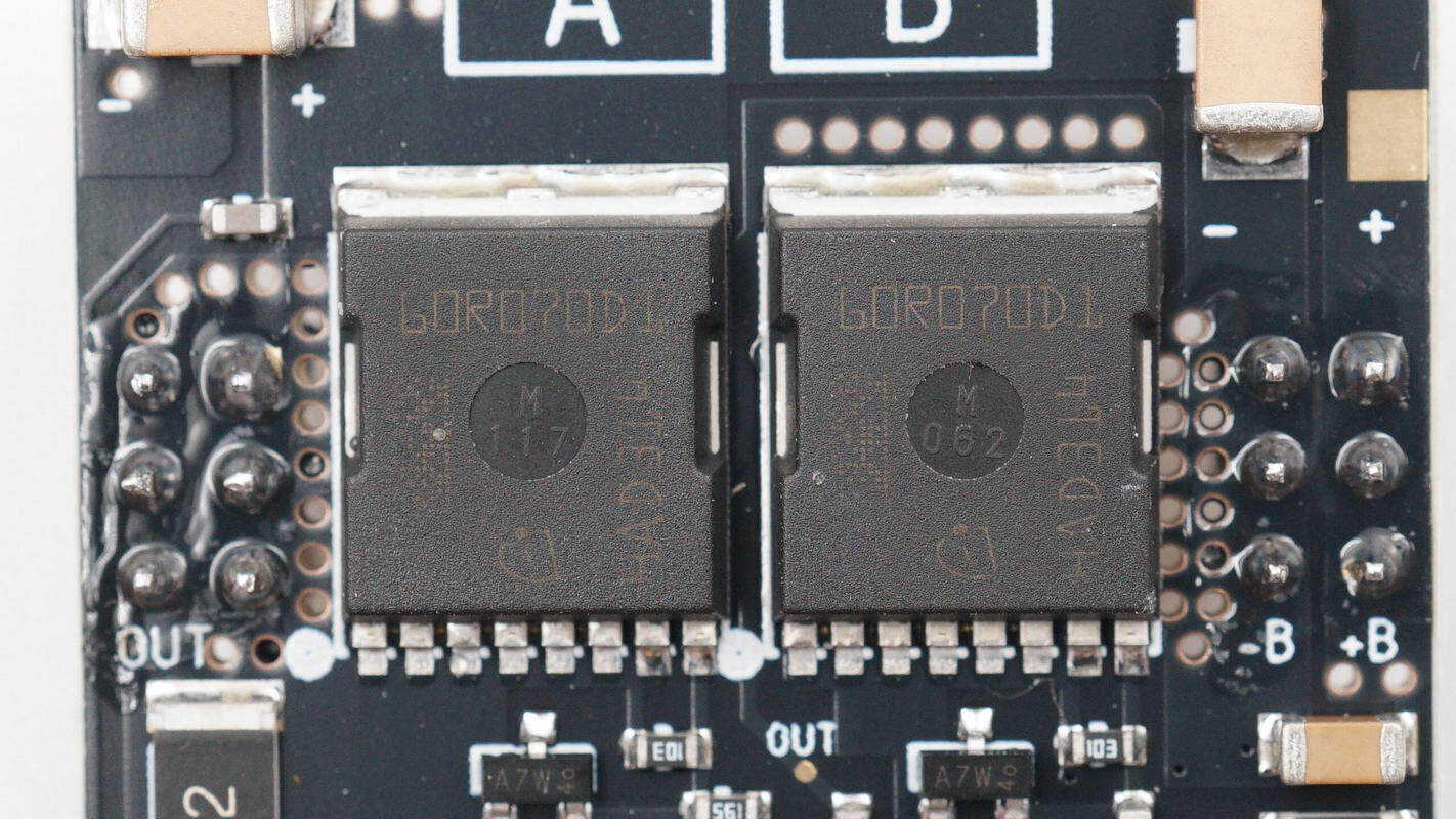 The primary MOSFETs are from WGSEMİ, model WGF65R190G. They are NMOS devices with a voltage rating of 650V, an on-resistance of 165mΩ, and come in a TO-220F package.