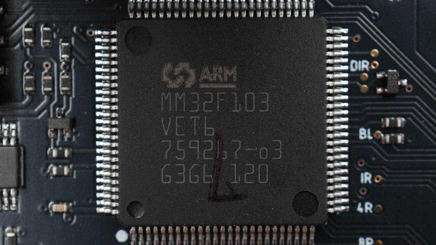 The MCU is from MindMotion, model MM32F103VET6. It features an ARM Cortex-M3 core running at 96 MHz, with 512 KB of flash memory and 128 KB of SRAM. It supports a 2.0–5.5 V operating voltage and provides 8 UART interfaces, 2 I²C interfaces, 3 SPI interfaces, 1 CAN interface, 1 USB OTG interface, and 1 SDIO interface. The device comes in an LQFP100 package.