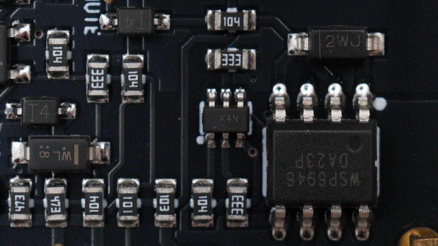 The MOSFET used for output control is from WINSOK, model WSP6946. It is a dual NMOS with a voltage rating of 60 V, an on-resistance of 33 mΩ, and comes in an SOP-8 package.