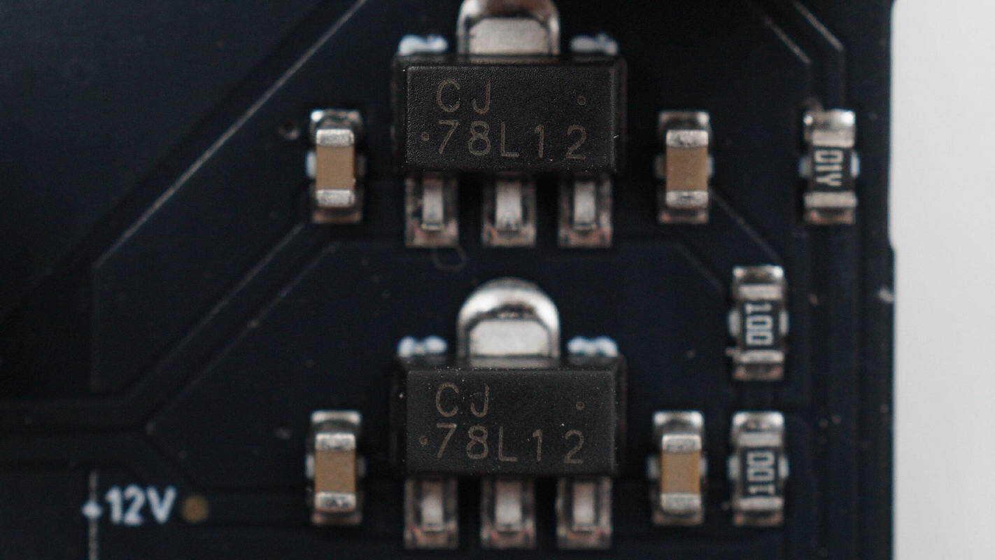 The two regulator chips are from JSCJ, model CJ78L12. They support an input voltage of 35V, an output of 12V at 100mA, and come in an SOT-89-3L package.